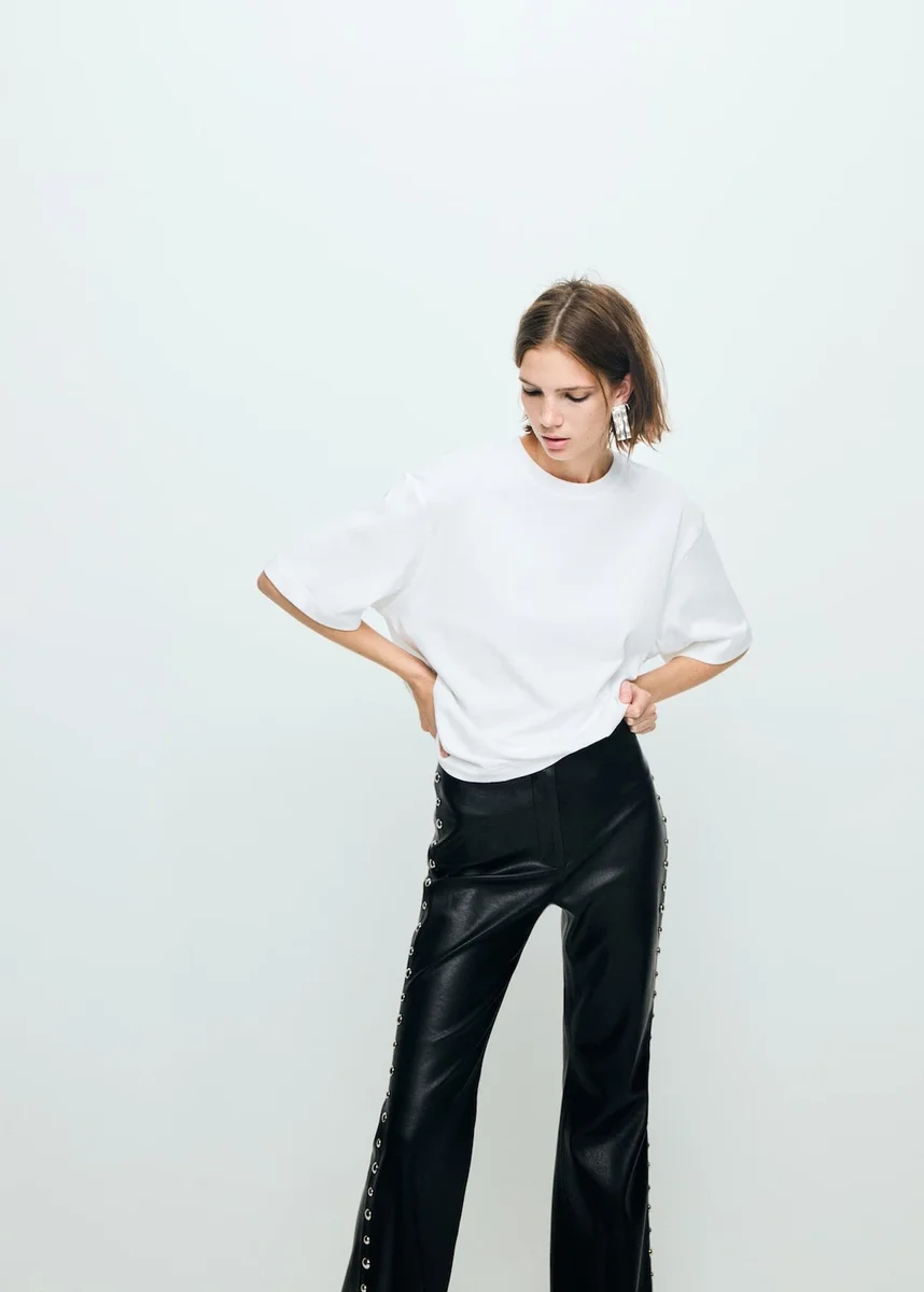 Efekt skóry. Długi fason. Rozszerzany krój. Średni stan. Ozdobne ćwieki. Ukryte zapięcie na guziki, haczyki i zamek błyskawiczny. Podszewka wewnętrzna. Ta część garderoby należy do naszej kolekcji imprezowej i okolicznościowej, zaprojektowanej, aby podkreślić Twój wygląd podczas specjalnych okazji.