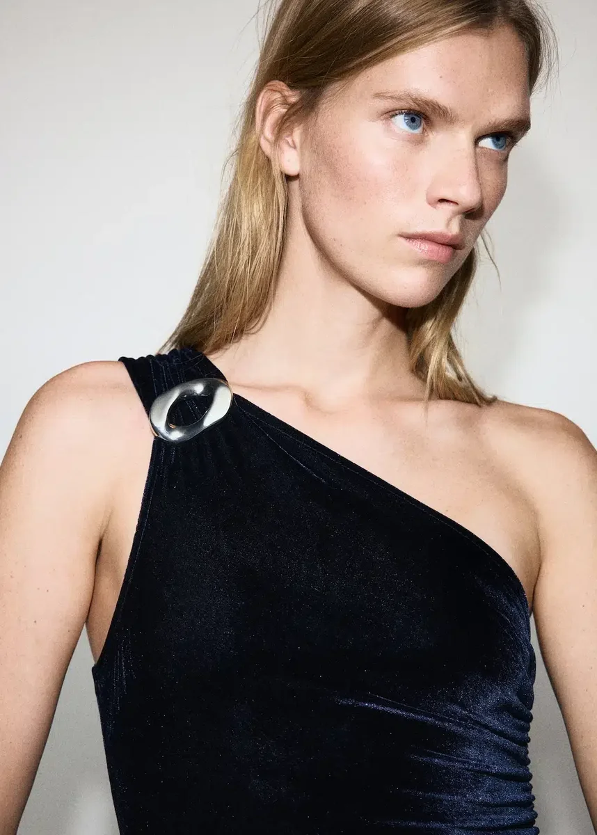 Aksamitna tkanina. Długi krój. Dopasowany krój. Asymetryczny dekolt. Metaliczne detale. Falbany po bokach. Boczne zapięcie na zamek błyskawiczny. Ten produkt należy do naszej kolekcji imprezowej i wieczorowej, zaprojektowanej z myślą o podkreśleniu Twojej stylizacji na specjalne okazje.