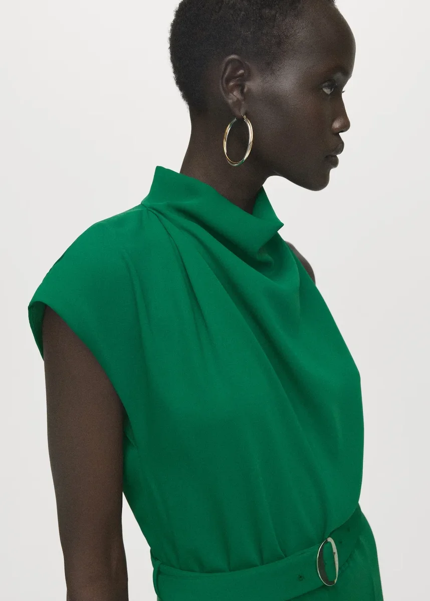 Długi krój. Prosty krój. Drapowana szyja. Asymetryczne rękawy. Szlufki. Zapięcie na klamrę paska. Zapięcie na guziki przy szyi. Podszewka wewnętrzna. Ta odzież należy do naszej kolekcji eventowej, zaprojektowanej tak, abyś była idealnym gościem na każdym przyjęciu, weselu lub uroczystości.
