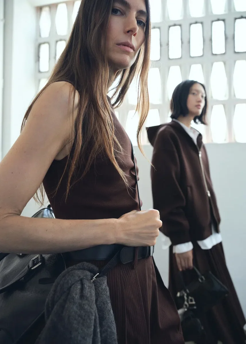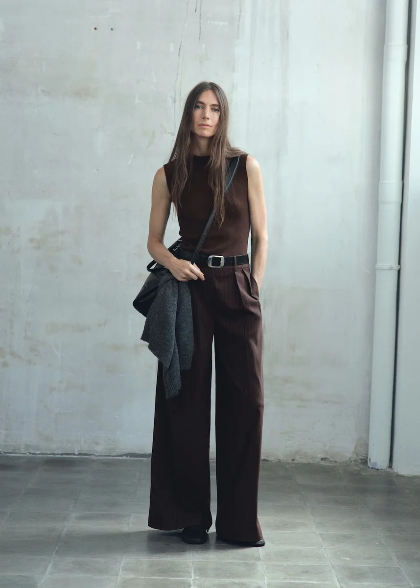 Długi fason. Prosty krój. Wzór w prążki. Kombinowany fason. Stójka. Bez rękawów. Szerokie ramiączka. Szlufki. Zapięcie na zamek błyskawiczny z tyłu. Kolor brązowy jest dostępny wyłącznie w sprzedaży internetowej.
