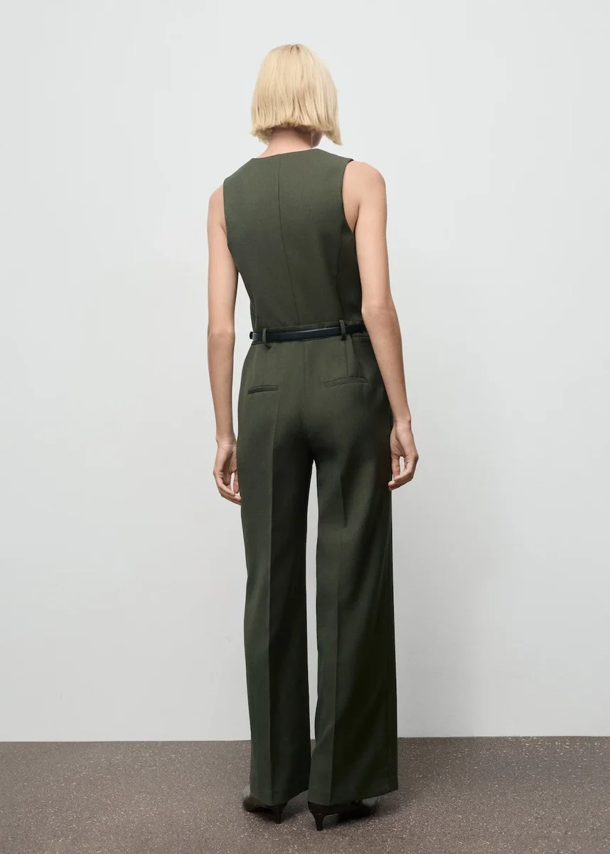 Długi krój. Prosty krój. Dekolt w szpic. Bez rękawów. Szerokie ramiączka. Dwie kieszenie boczne. Szlufki. Zapięcie na klamrę. Dwie kieszenie z tyłu. Zapięcie na zamek błyskawiczny i guzik. Podszewka wewnętrzna.