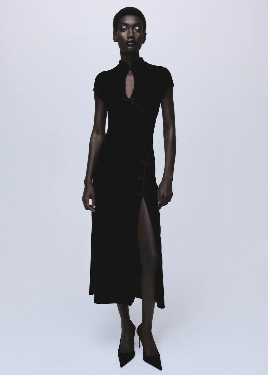 Aksamitna tkanina. Długość midi. Dopasowany krój. Stójka. Krótkie rękawy. Okrągłe wycięcie na piersi. Boczne rozcięcie u dołu. Zapięcie na zatrzaski. Ekskluzywny produkt dostępny online. Ta sukienka należy do naszej kolekcji imprezowej i wieczorowej, stworzonej z myślą o podkreśleniu Twojej stylizacji na specjalne okazje.