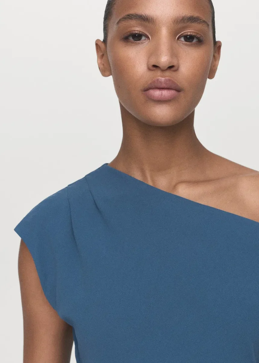 Długość midi. Krój w kształcie litery A. Asymetryczny dekolt. Bez rękawów. Draperie w talii. Boczne zapięcie na zamek błyskawiczny.