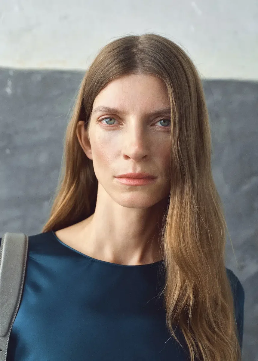 Satynowa tkanina. Długi fason. Dopasowany krój. Okrągły dekolt. Długie rękawy. Rozcięcie z tyłu u dołu. Zapięcie na guziki przy szyi