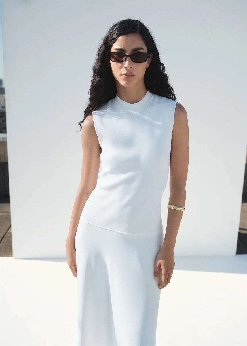 Długi fason. Fason w kształcie litery A. Połączenie fasonów. Okrągły dekolt. Bez rękawów. Szerokie ramiączka. Zapięcie z tyłu na zamek błyskawiczny