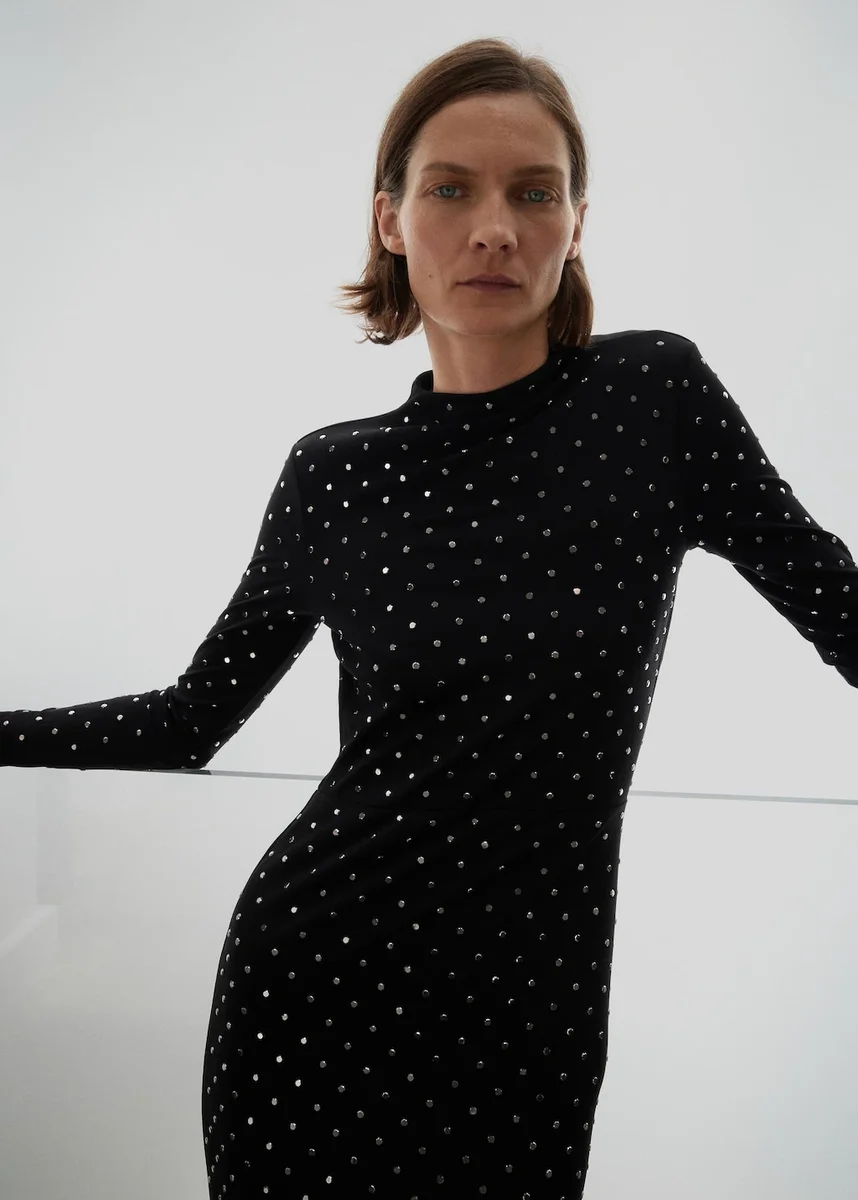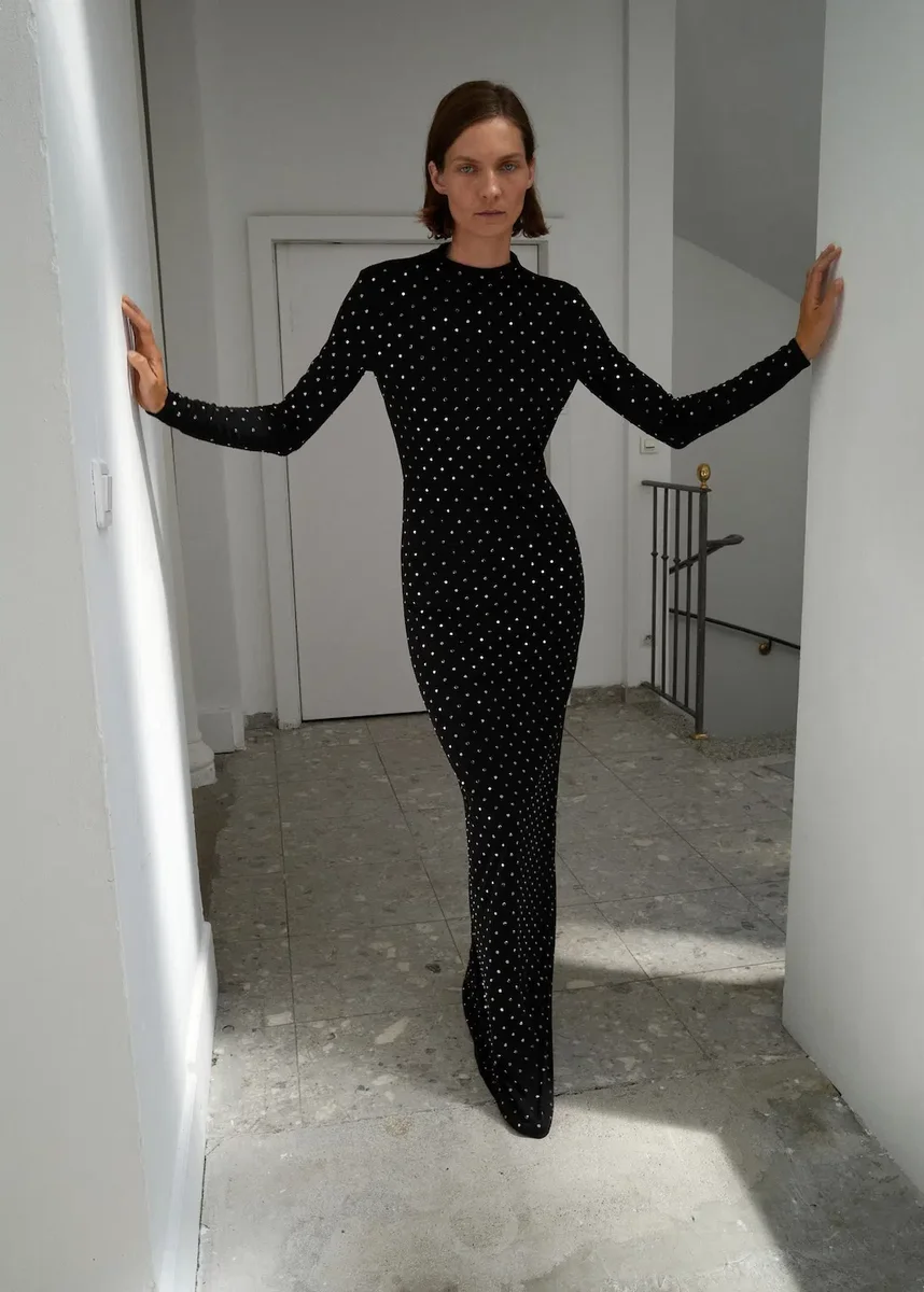 Długi fason. Dopasowany krój. Stójka. Długi rękaw. Otwarte plecy. Kryształowe aplikacje. Zapięcie na haftki z tyłu. Kolekcja Selection. Wybór wyrafinowanych ubrań, wykonanych z wysokiej jakości materiałów, które tworzą kobiecą i nowoczesną garderobę.