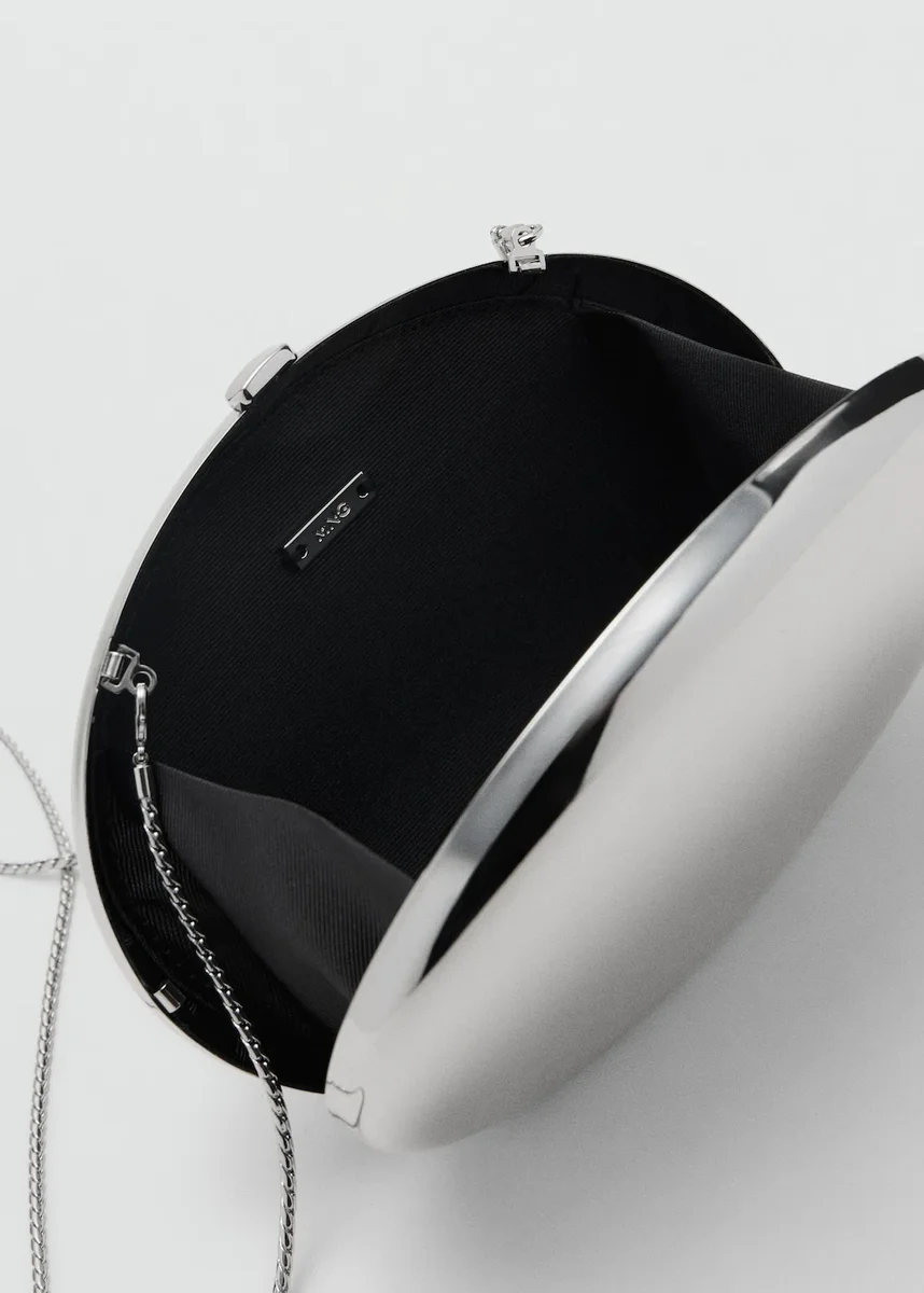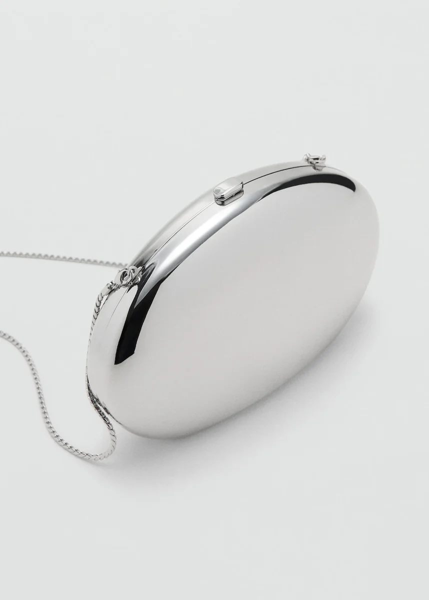 Metaliczny wzór. Owalny kształt. Styl kopertówki. Długi odpinany łańcuszek. Metalowe zapięcie na zatrzask. Wewnętrzna podszewka.