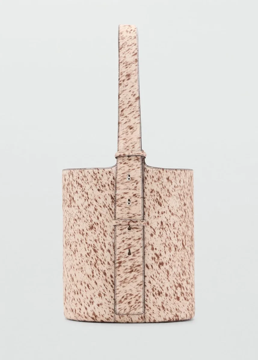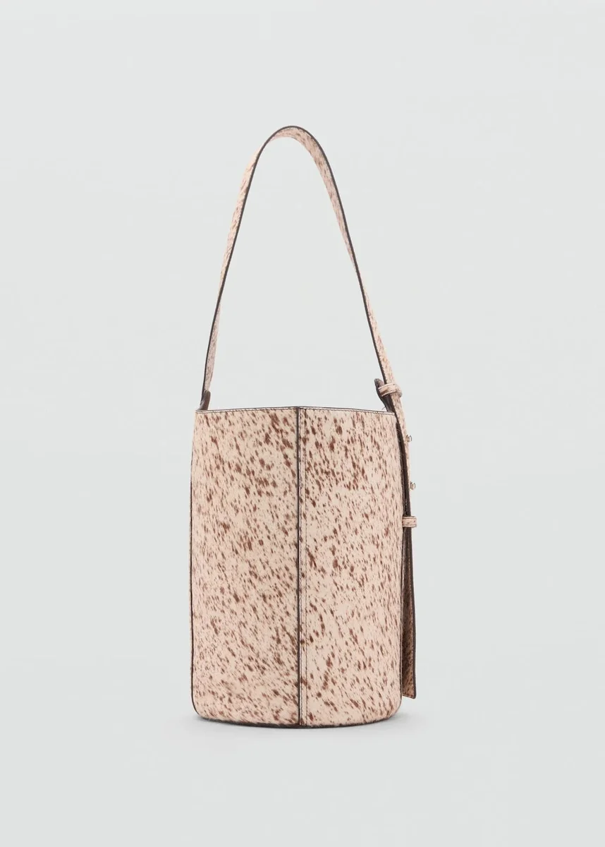 100% skóra bydlęca z włosiem. Kształt wiadra. Regulowany pasek na ramię. Mała wewnętrzna kieszeń. Bez zapięcia. Podszewka 100% bawełna.