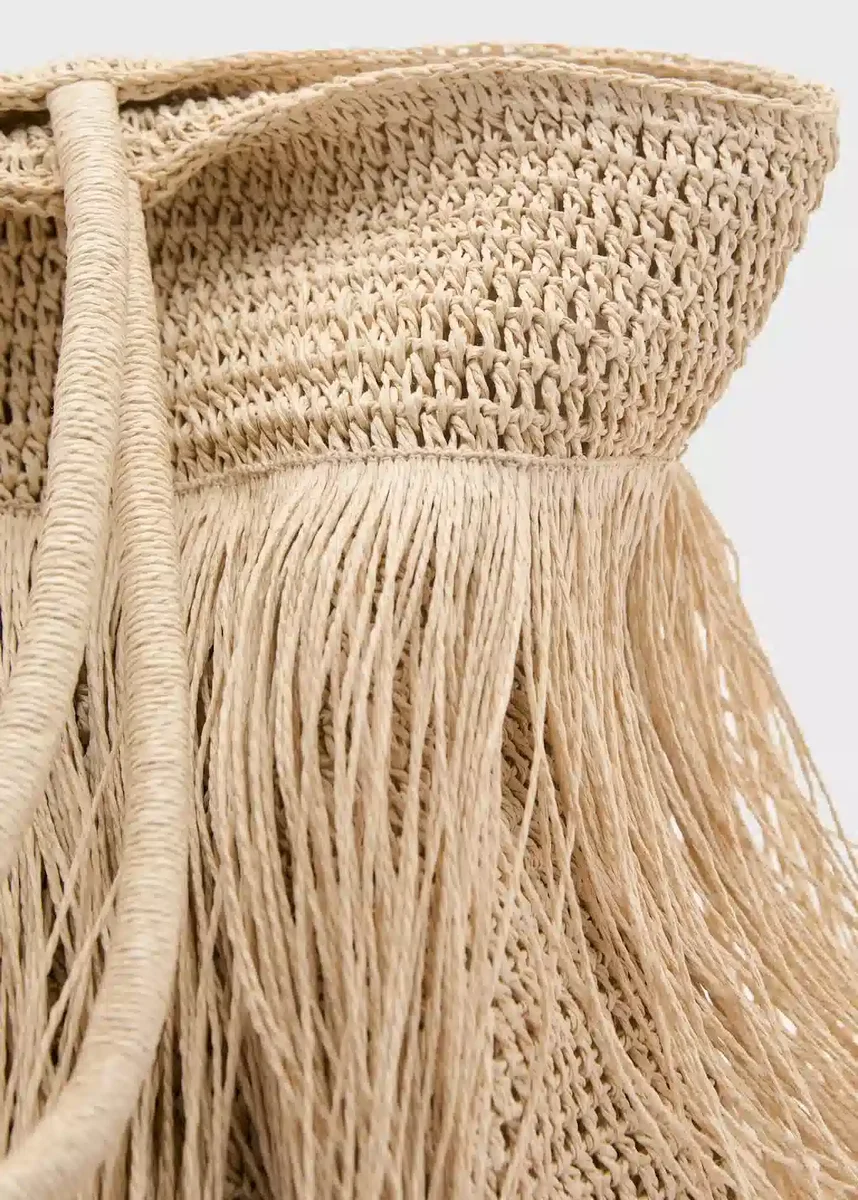 Duży rozmiar. Tkanina z naturalnego włókna. Podwójne uchwyty. Frędzle. Wewnętrzna kieszeń. Zapięcie na magnetyczny guzik.