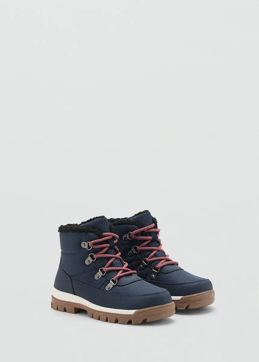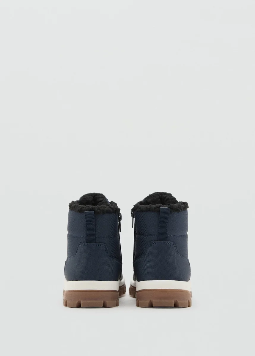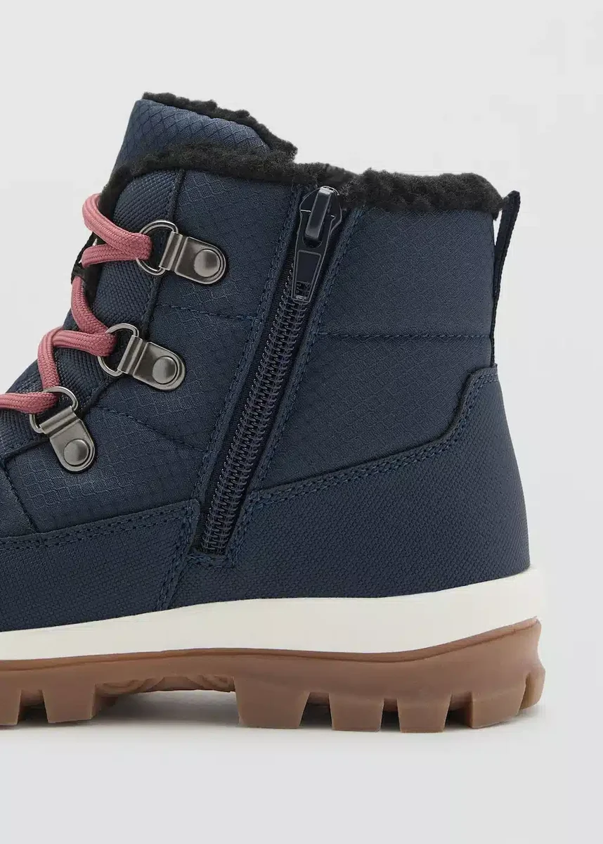 Styl botków. Podeszwa z gumy z ząbkami. Okrągły nosek. Zapięcie na sznurowadła. Zapięcie na zamek błyskawiczny. Wnętrze z imitacji owczej skóry.