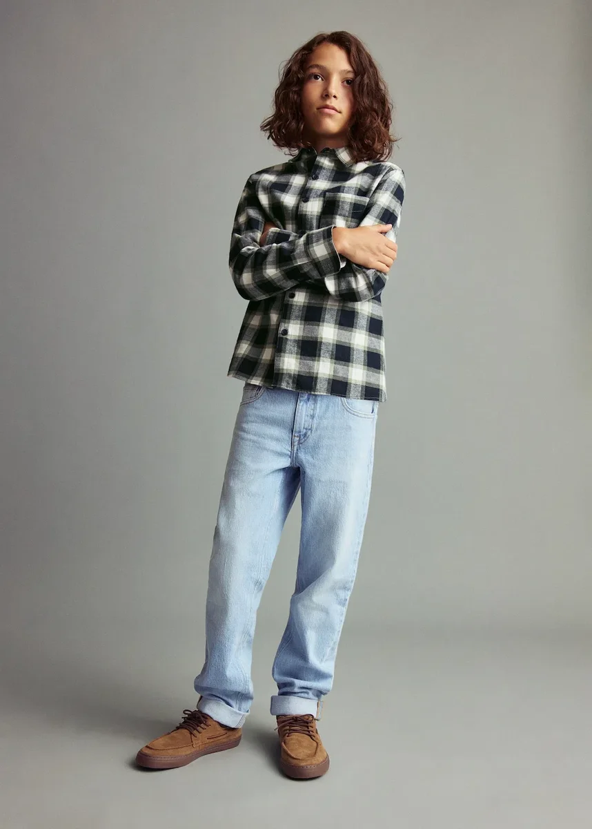 100% bawełna. Prosty krój. Kratka. Kołnierzyk koszulowy. Długie rękawy z mankietami zapinanymi na guziki. Zapięcie na guziki z przodu. Naszywana kieszeń z przodu. Powrót do szkoły.