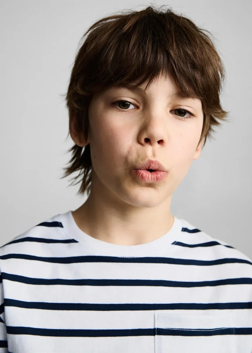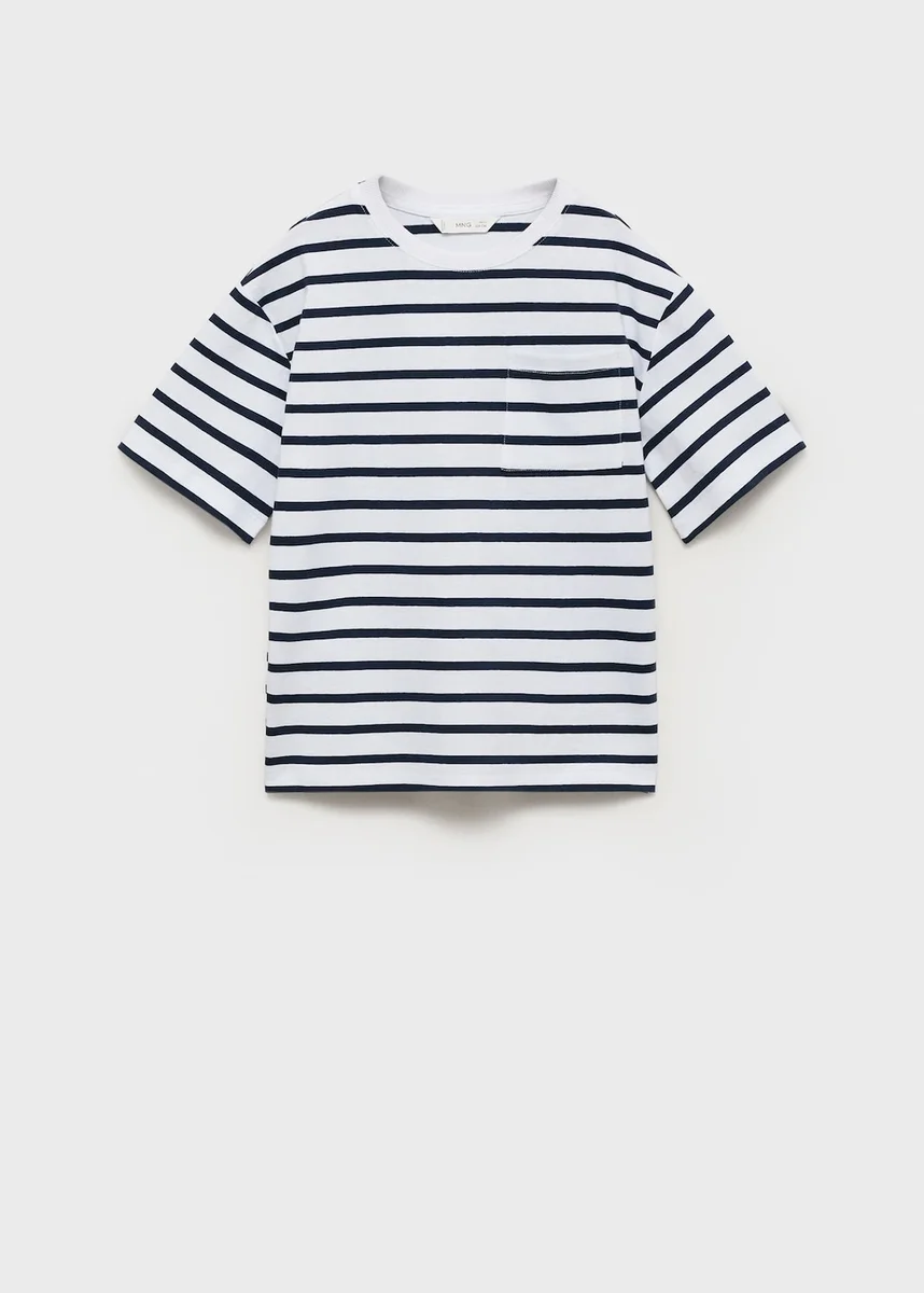 100% bawełna. Paski. Kieszeń na piersi. Kontrastowy kołnierzyk. Okrągły dekolt z prążkowanym wykończeniem. Krótkie rękawy