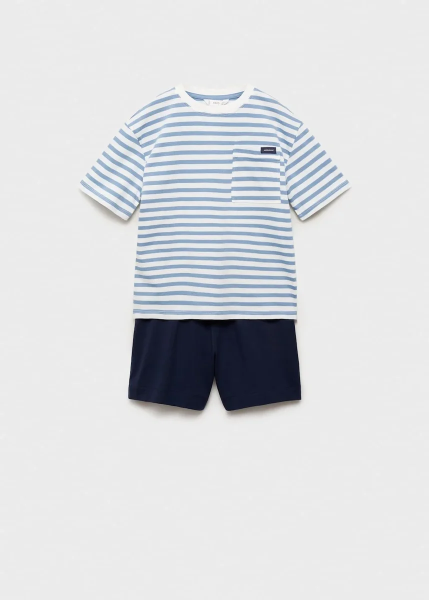Zestaw składający się z koszulki z krótkim rękawem i krótkich spodni piżamowych. 100% bawełna. Wzór w paski. Koszulka. Okrągły dekolt. Naszywana kieszeń z przodu. Spodenki. Elastyczny pas ze sznurkiem. Produkt promocyjny