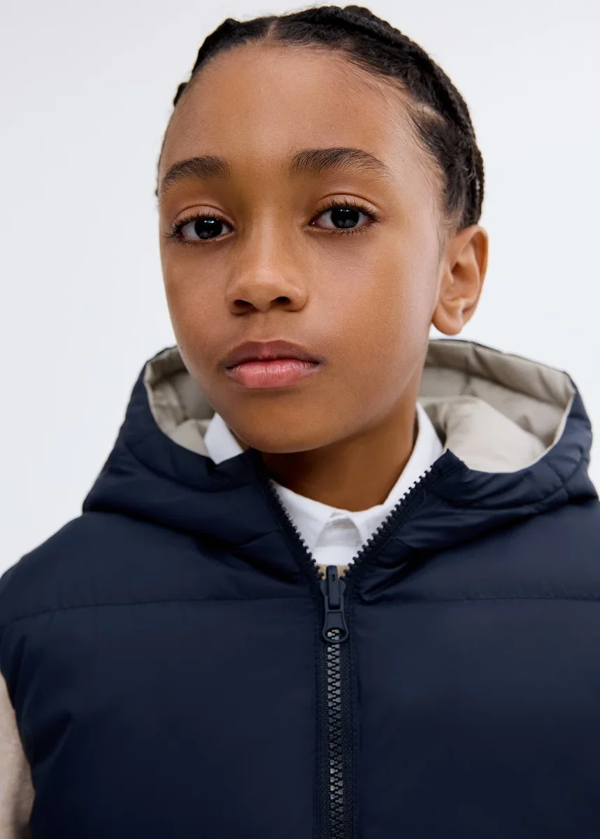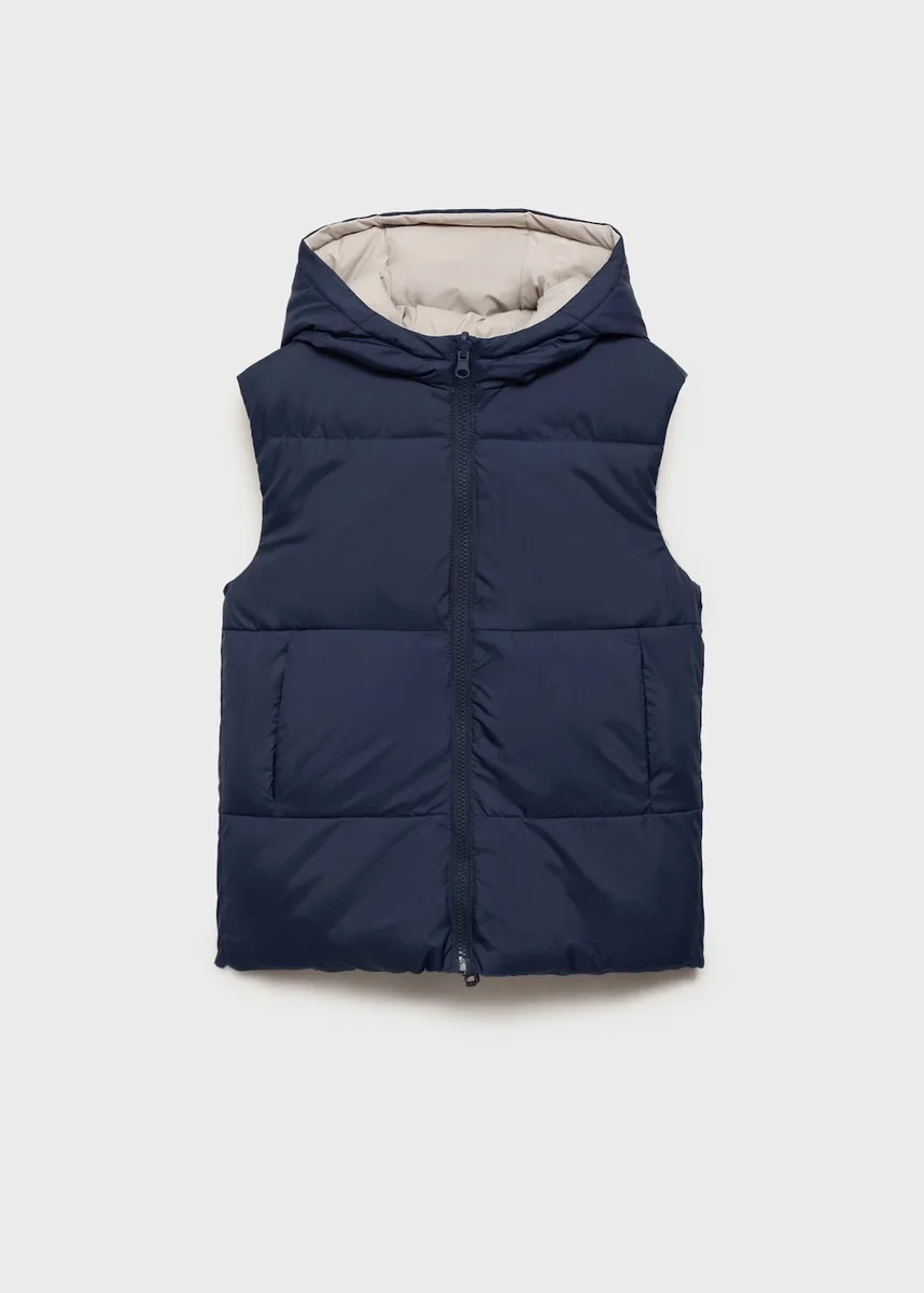 Pikowana tkanina. Wodoodporna tkanina. Dwustronny design. Prosty krój. Dwukolorowa. Z kapturem. Bez rękawów. Dwie kieszenie boczne. Zapięcie na zamek błyskawiczny.