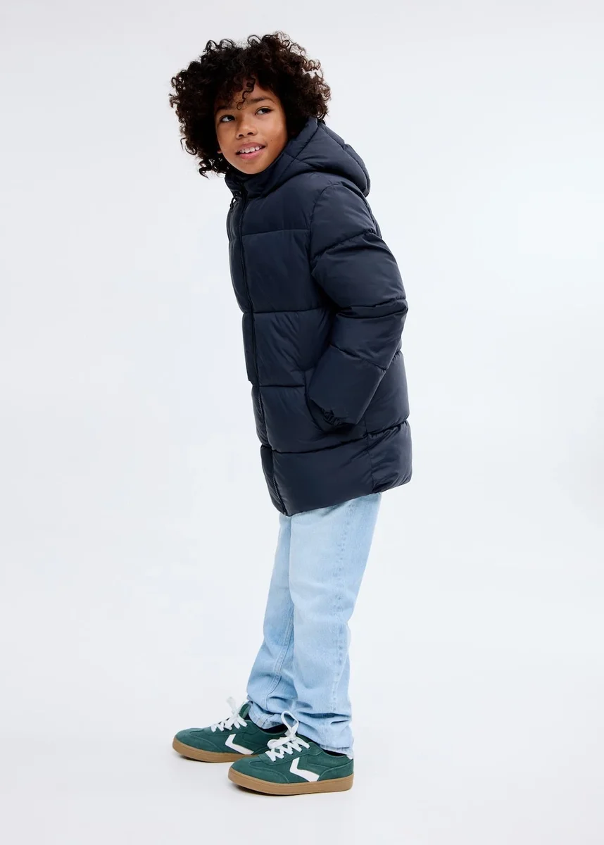 Pikowana tkanina. Tkanina wodoodporna. Prosty krój. Długi krój. Z kapturem. Długie rękawy z elastycznymi mankietami. Zapięcie na zamek błyskawiczny. Dwie kieszenie boczne. Wewnętrzna podszewka z polaru