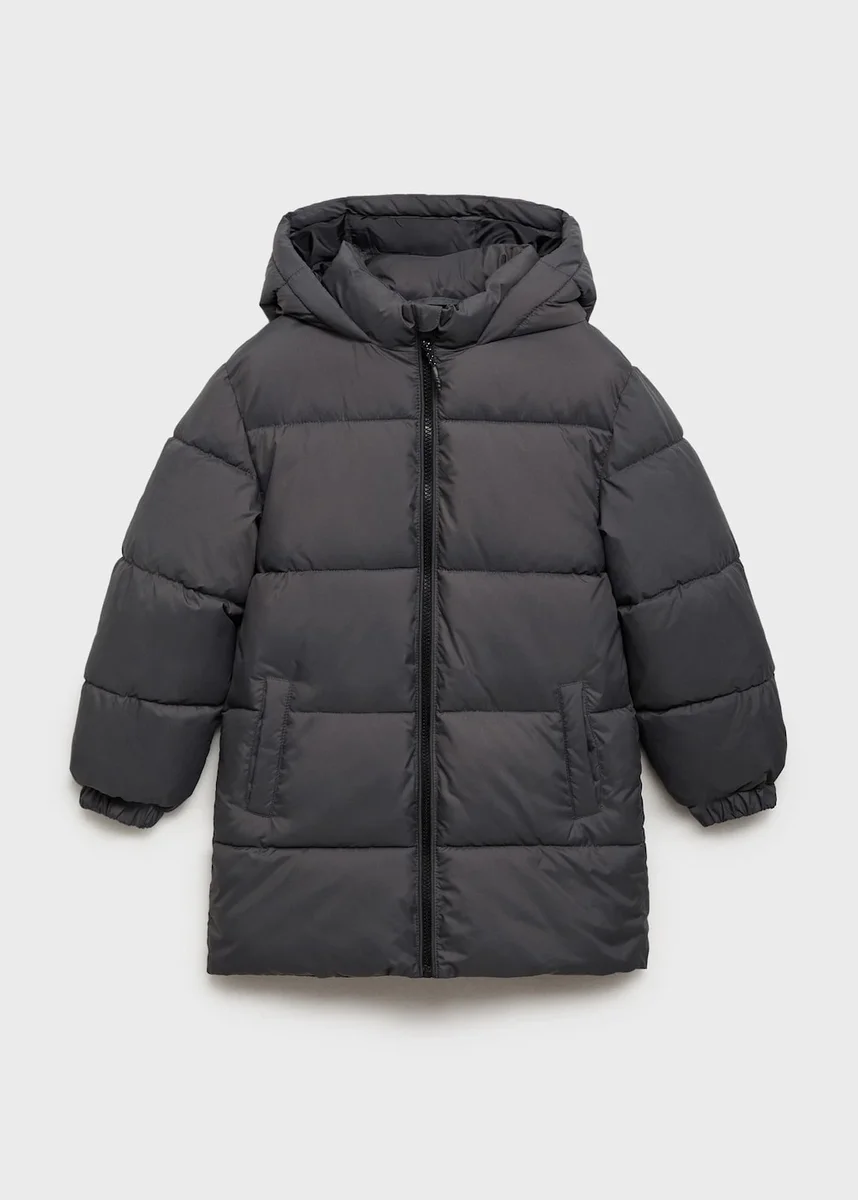 Pikowana tkanina. Tkanina wodoodporna. Prosty krój. Długi krój. Z kapturem. Długie rękawy z elastycznymi mankietami. Zapięcie na zamek błyskawiczny. Dwie kieszenie boczne. Wewnętrzna podszewka z polaru