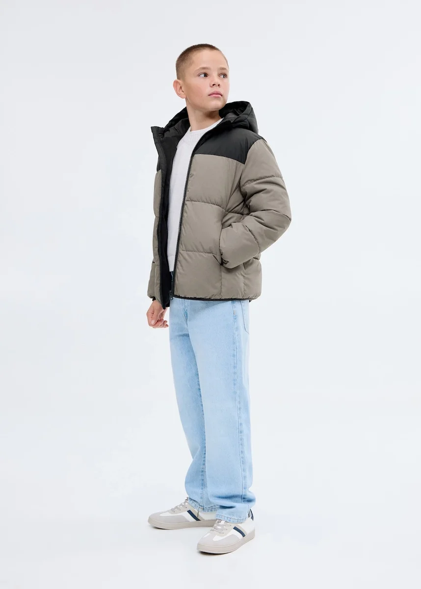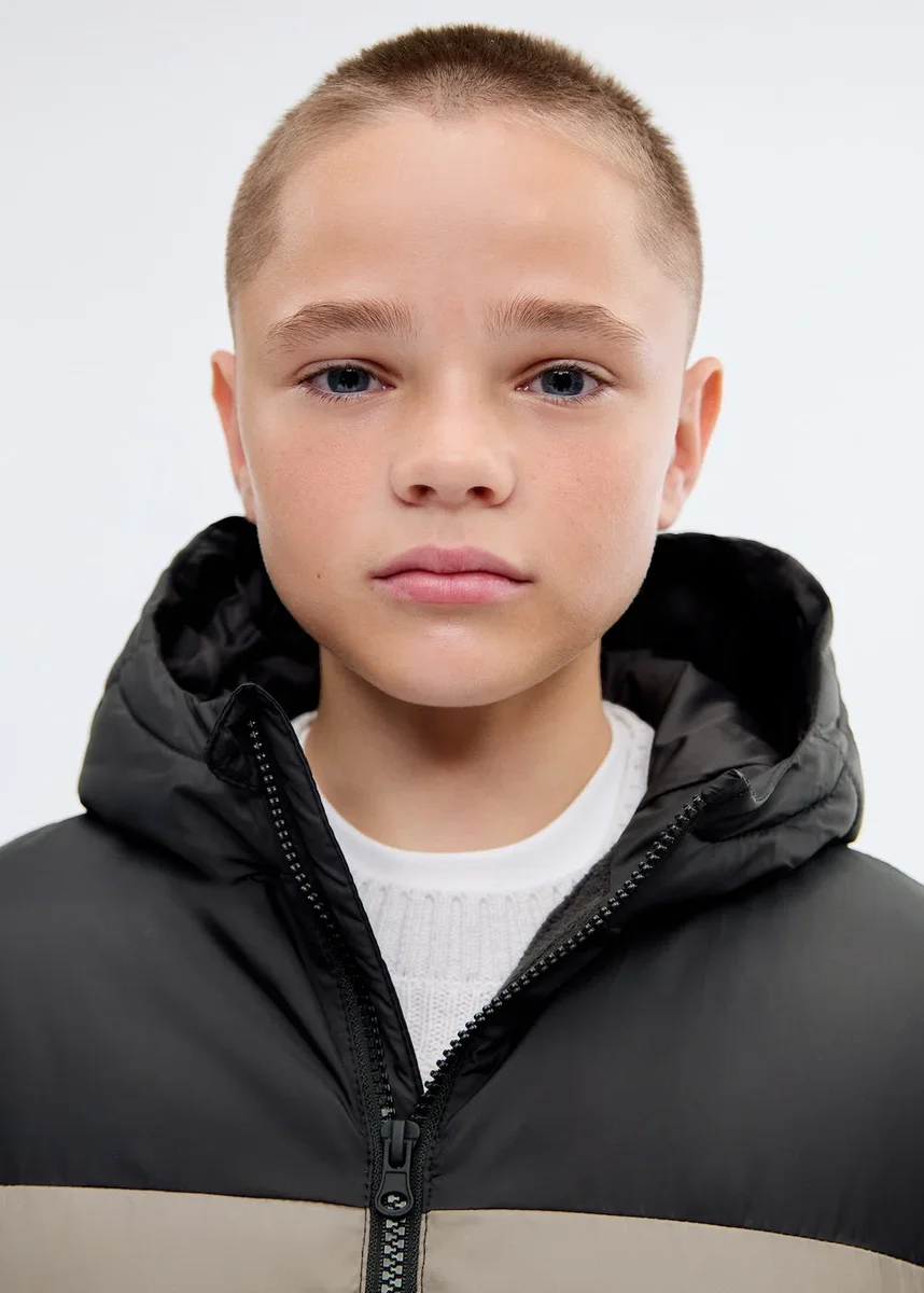 Pikowana tkanina. Dwukolorowa. Prosty krój. Z kapturem. Długie rękawy. Zapięcie na zamek błyskawiczny. Dwie kieszenie boczne. Wewnętrzna podszewka z polaru
