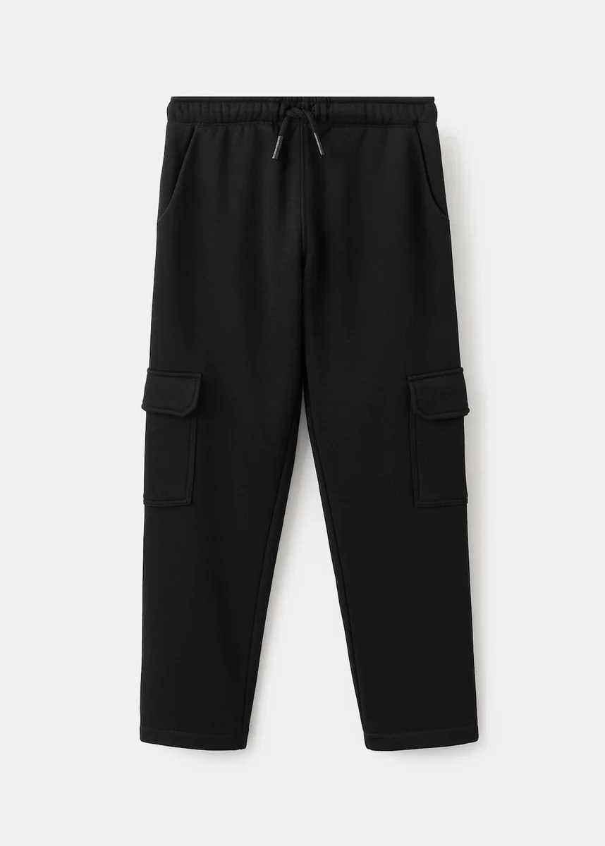 Tkanina bawełniana. Długi krój. Krój cargo. Elastyczny pas z sznurkiem. Dwie kieszenie boczne. Pikowana bawełniana podszewka.