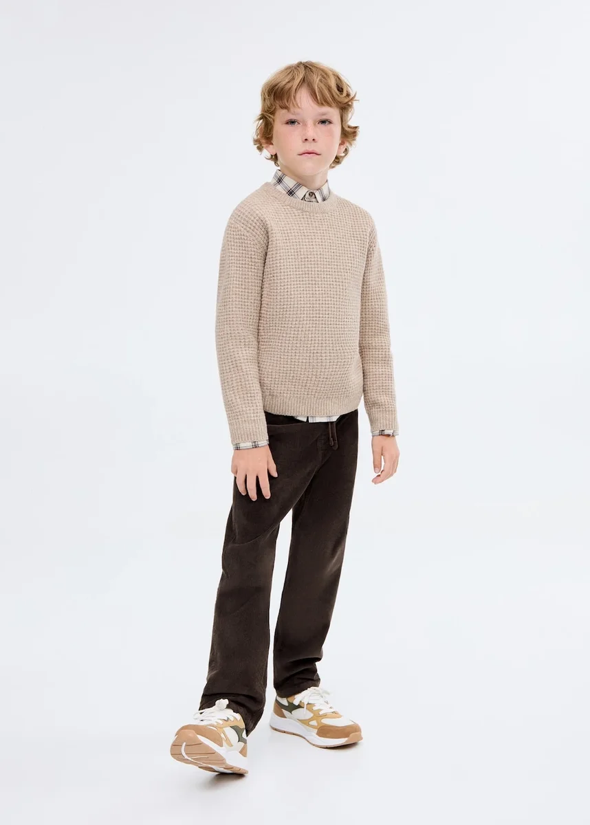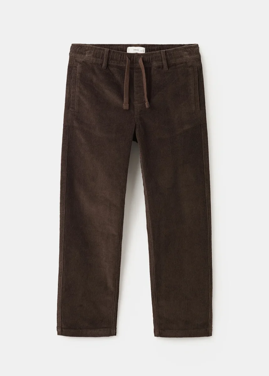 Wykonane z bawełny i sztruksu, te proste spodnie mają elastyczny pas z sznurkiem i szlufkami. Posiada dwie kieszenie boczne i dwie kieszenie z tyłu.