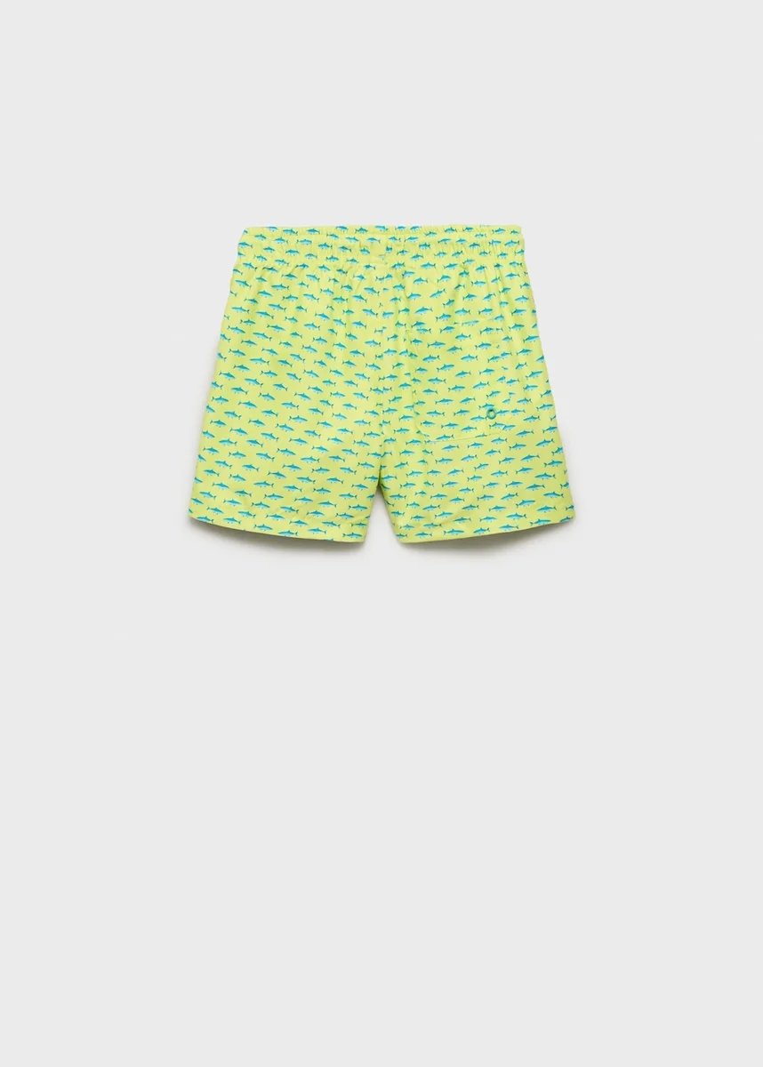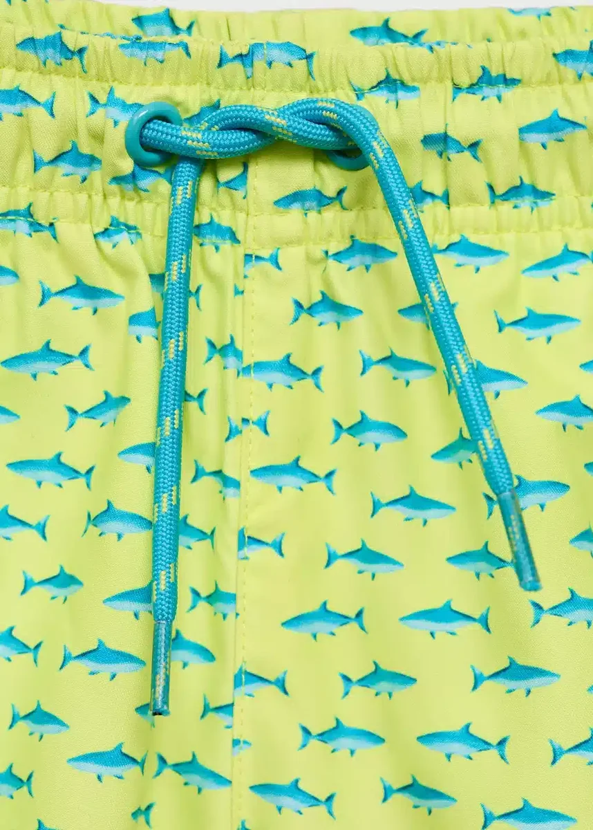 Nadruk z motywem rekinów. Prosty krój. Elastyczny pas ze sznurkiem.