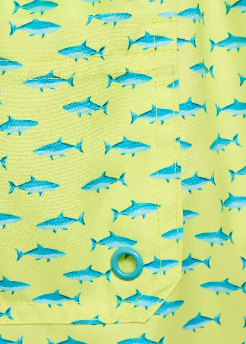 Nadruk z motywem rekinów. Prosty krój. Elastyczny pas ze sznurkiem