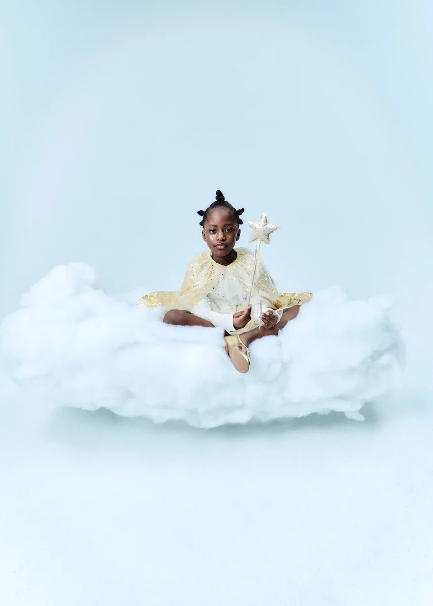 Tkanina z cekinami. Detale z tiulu. Motyw gwiazdy. Zapięcie na rzep. Całkowity wygląd. Kolekcja Halloween. Czarny piątek