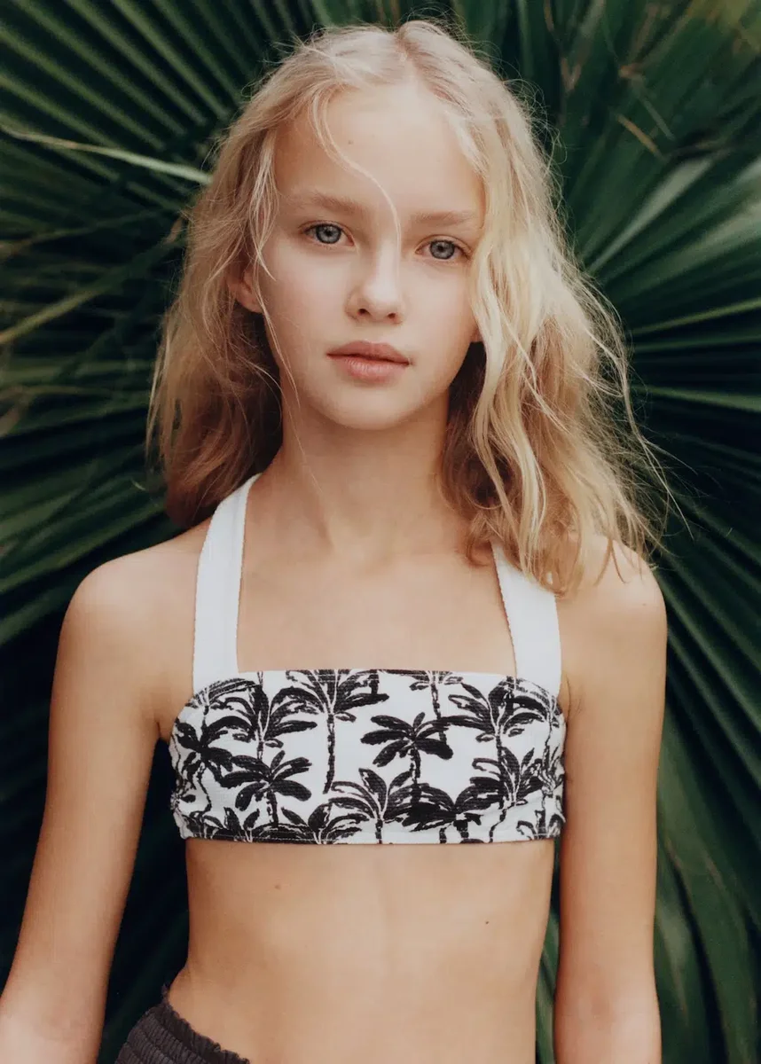 Elastyczny materiał. Nadruk palmowy. Ozdobne szelki z węzłami. Produkt promocyjny