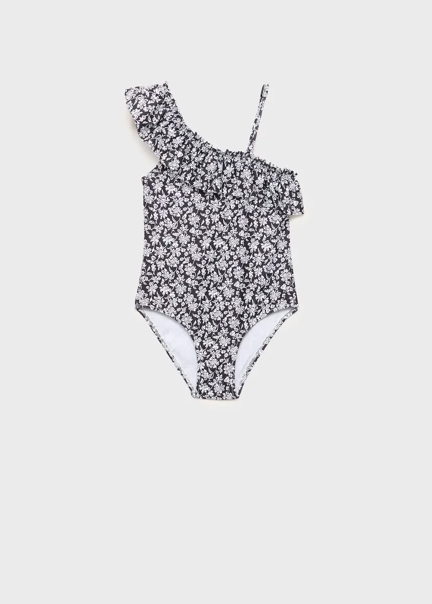 Elastyczny materiał. Kwiatowy wzór. Asymetryczny krój. Falbanki. Asymetryczny dekolt. Cienkie ramiączka. Falbaniaste ramiączka. Klasyczne figi. Podszewka wewnętrzna. Kolekcja strojów kąpielowych. Produkt promocyjny