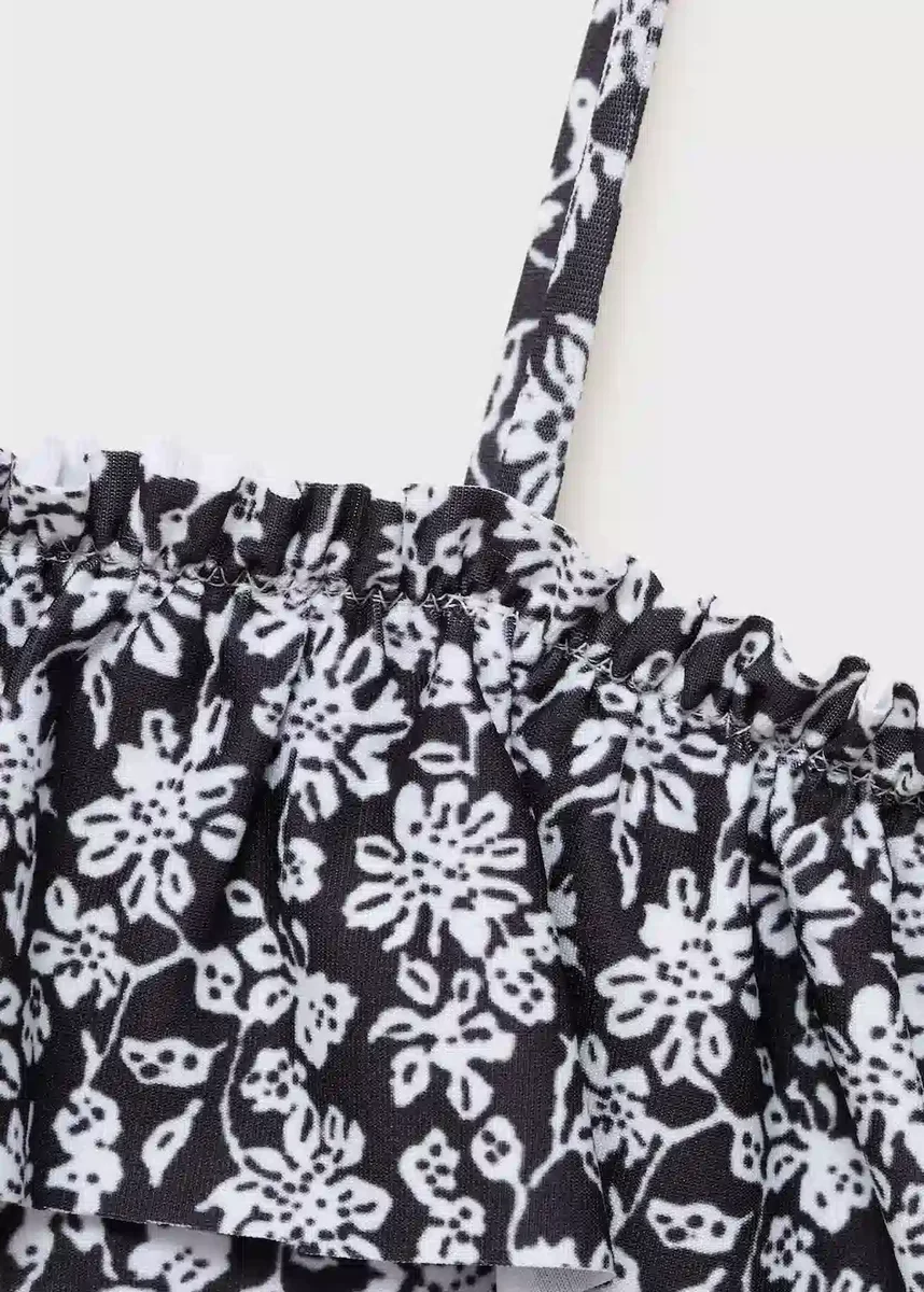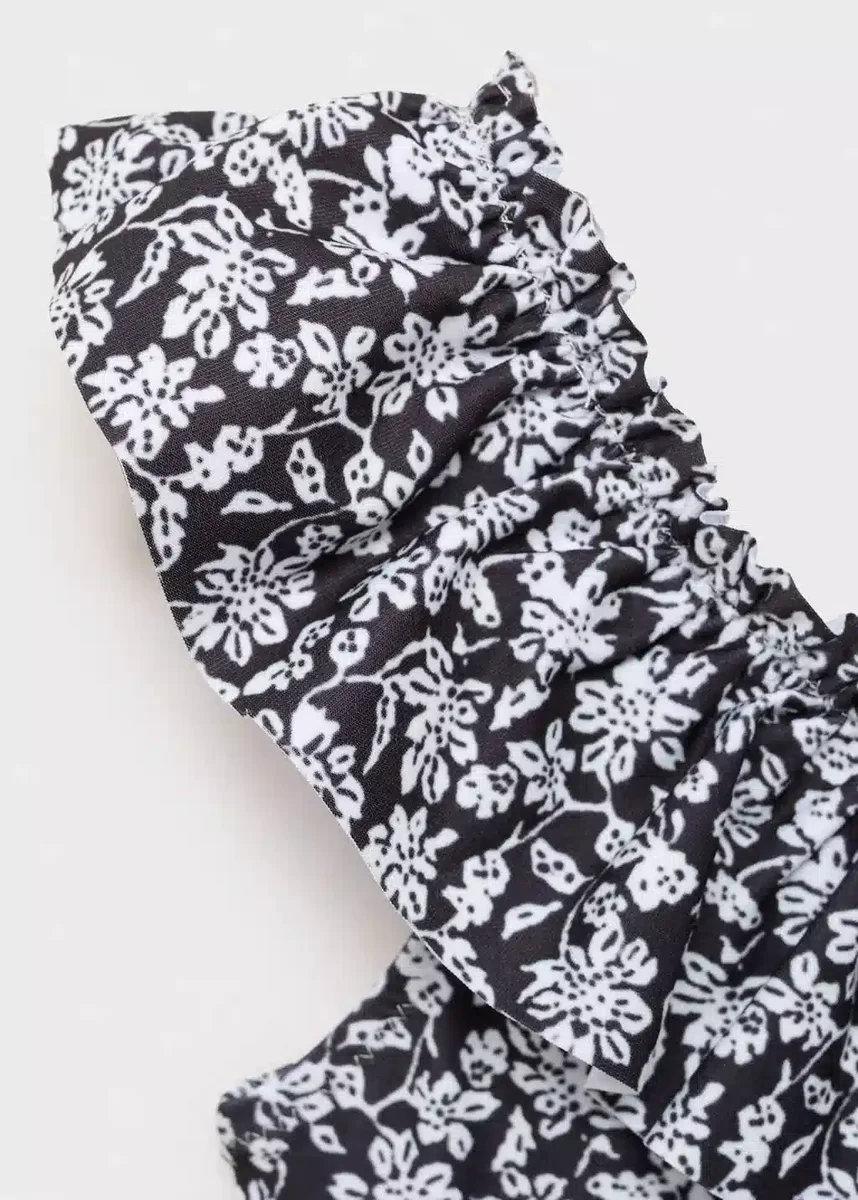 Elastyczny materiał. Kwiatowy wzór. Asymetryczny krój. Falbanki. Asymetryczny dekolt. Cienkie ramiączka. Falbaniaste ramiączka. Klasyczne majtki. Podszewka wewnętrzna. Kolekcja strojów kąpielowych. Produkt promocyjny.