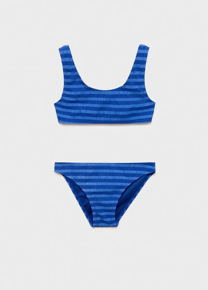 Oversize’owy kardigan z dzianiny. Elastyczny materiał. Nadruk w paski. Okrągły dekolt. Szerokie ramiączka. Klasyczne majtki. Kolekcja strojów kąpielowych. Produkt promocyjny