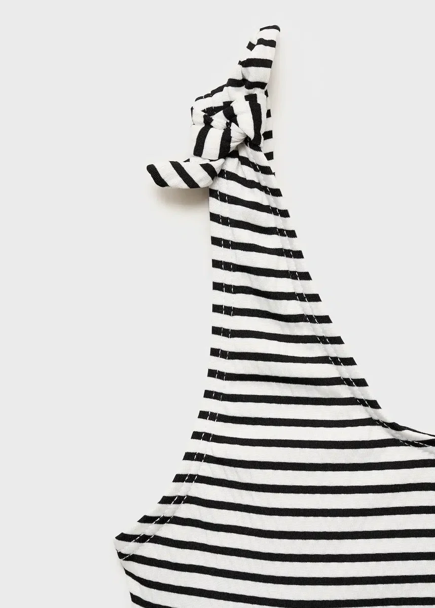 Elastyczny materiał. Wzór w paski. Okrągły dekolt. Ozdobne szelki wiązane. Klasyczne figi. Podszewka wewnętrzna. Kolekcja strojów kąpielowych. Produkt promocyjny.
