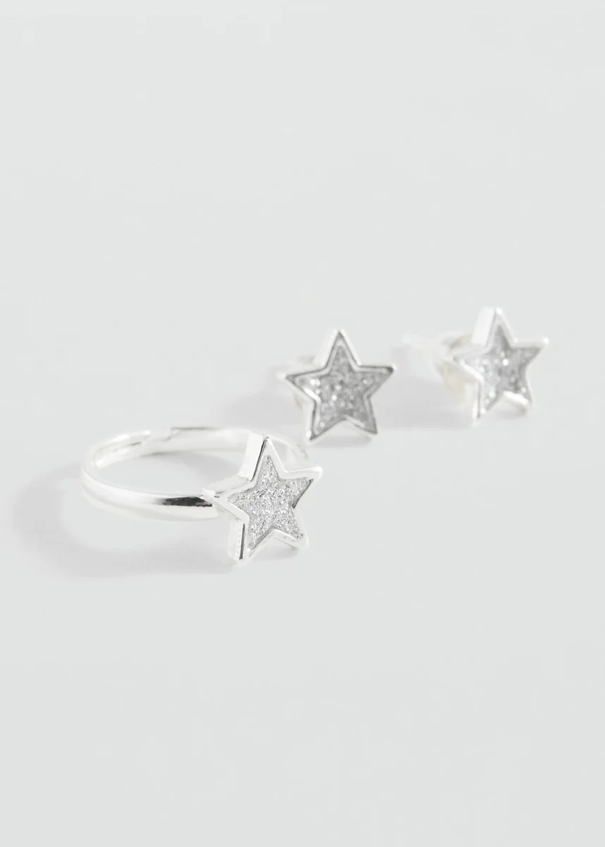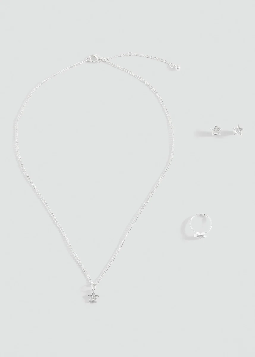 Zestaw 3 sztuk. Naszyjnik. Kolczyki. Pierścionek. Metaliczny wzór. Wzór gwiazdy. Jasny wzór.