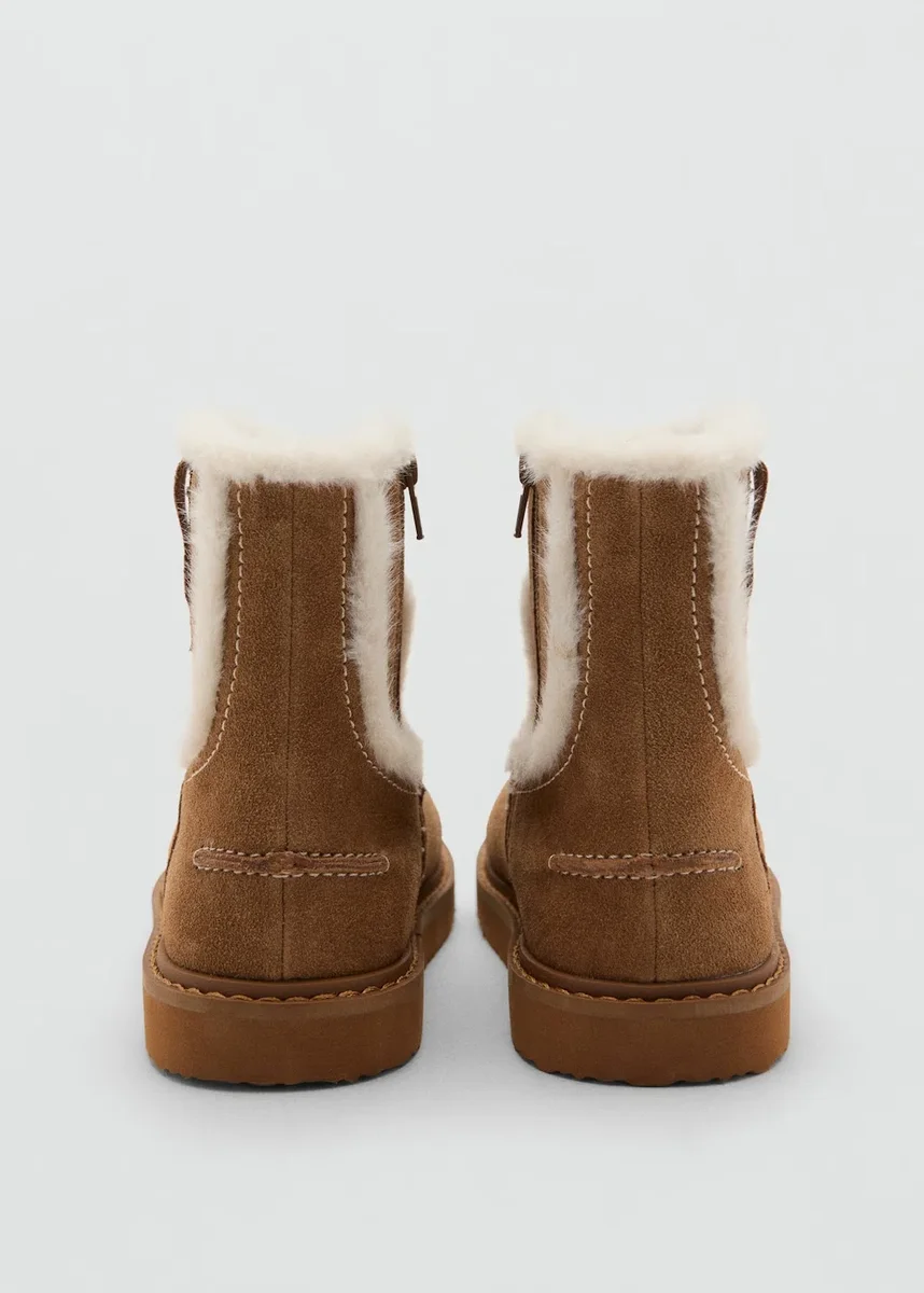 Skóra bydlęca. Zamsz. Podszewka z efektem futra. Detale z futrzanego splotu. Zaokrąglony nosek. Boczne zapięcie na zamek błyskawiczny