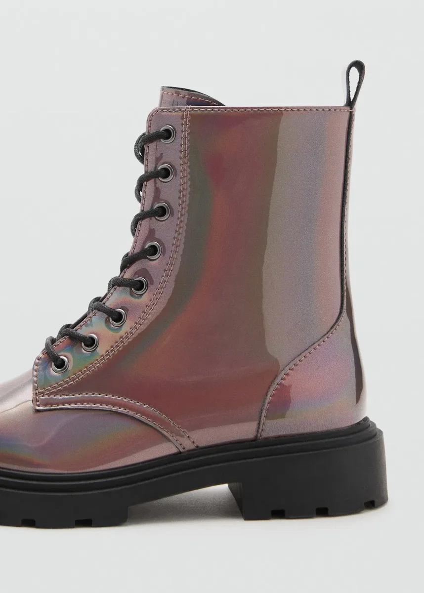 Metaliczne wykończenie. Okrągły nosek. Podeszwa typu track. Regulowane sznurowanie. Zapięcie na zamek błyskawiczny