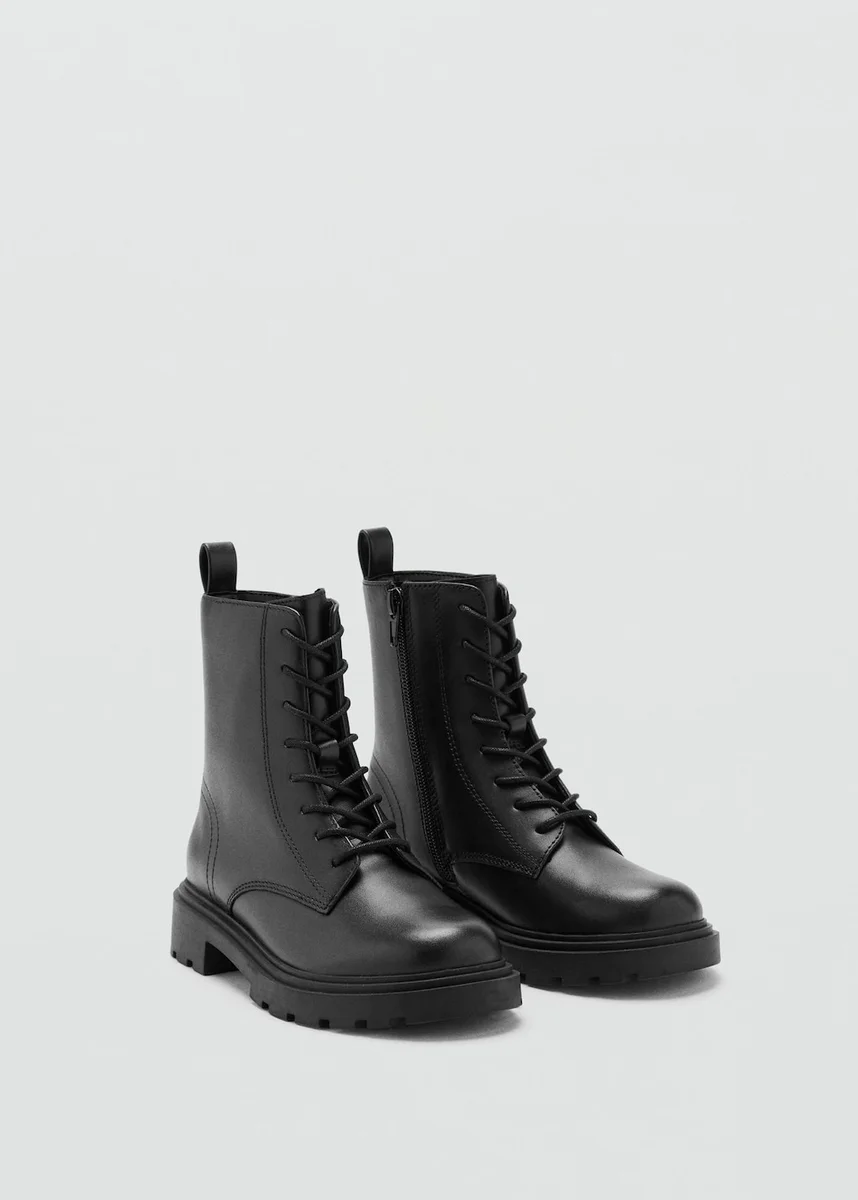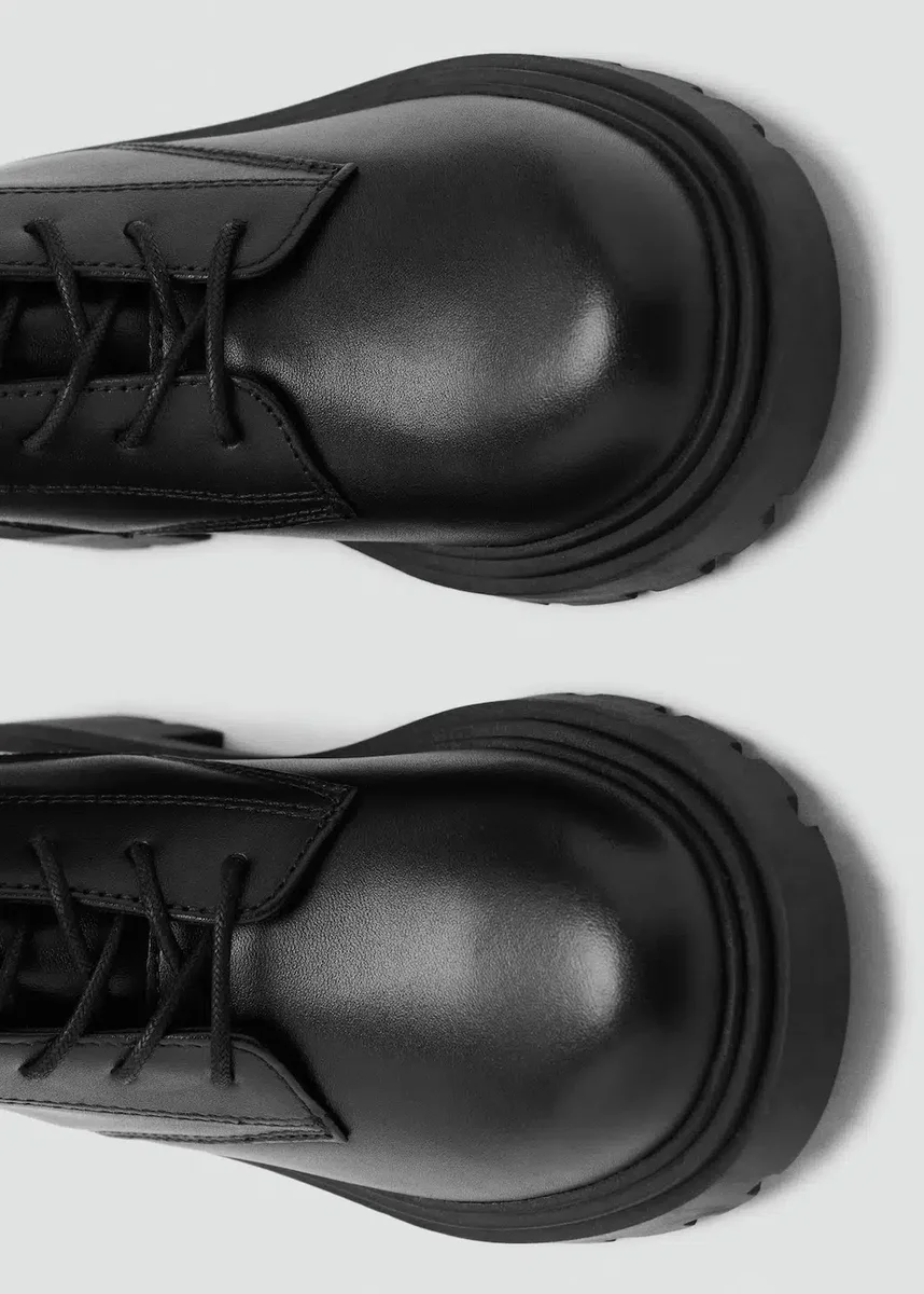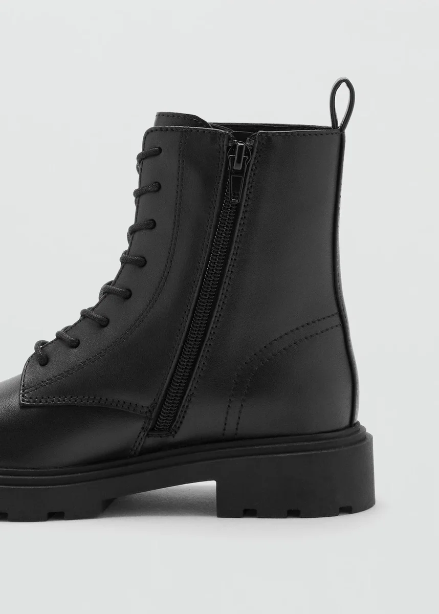 Skóra bydlęca. Okrągły nosek. Sznurowane zapięcie. Zapięcie na zamek błyskawiczny. Podeszwa z ząbkami.
