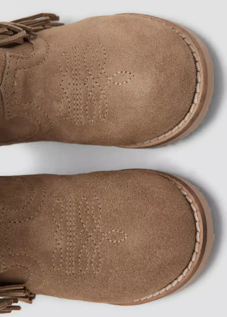 100% skóra bydlęca. Styl kowbojski. Zaokrąglony nosek. Aplikacja z frędzlami. Zapięcie na zamek błyskawiczny. Czarny piątek