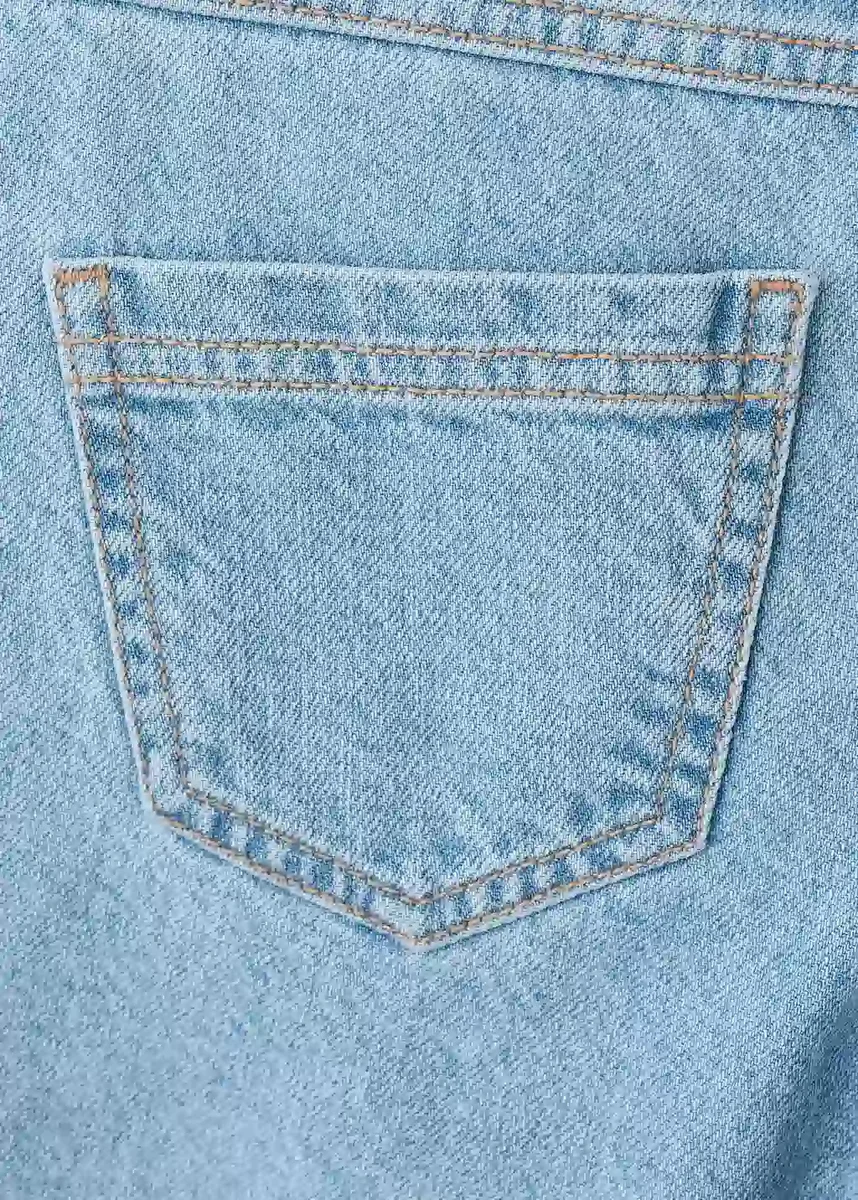 Standardowa długość. Prosty krój. Płaska struktura średnia. Regularna wysokość talii. 100% bawełna. Bawełniany dżins. Krojona spódnica-spodnie. Szlufki. Zapięcie na zamek błyskawiczny i guzik. Regulowany elastyczny pas z guzikiem. Kieszeń na monety. Dwie kieszenie boczne. Naszywane kieszenie z tyłu. Bezszwowy brzeg. Postrzępiony brzeg.