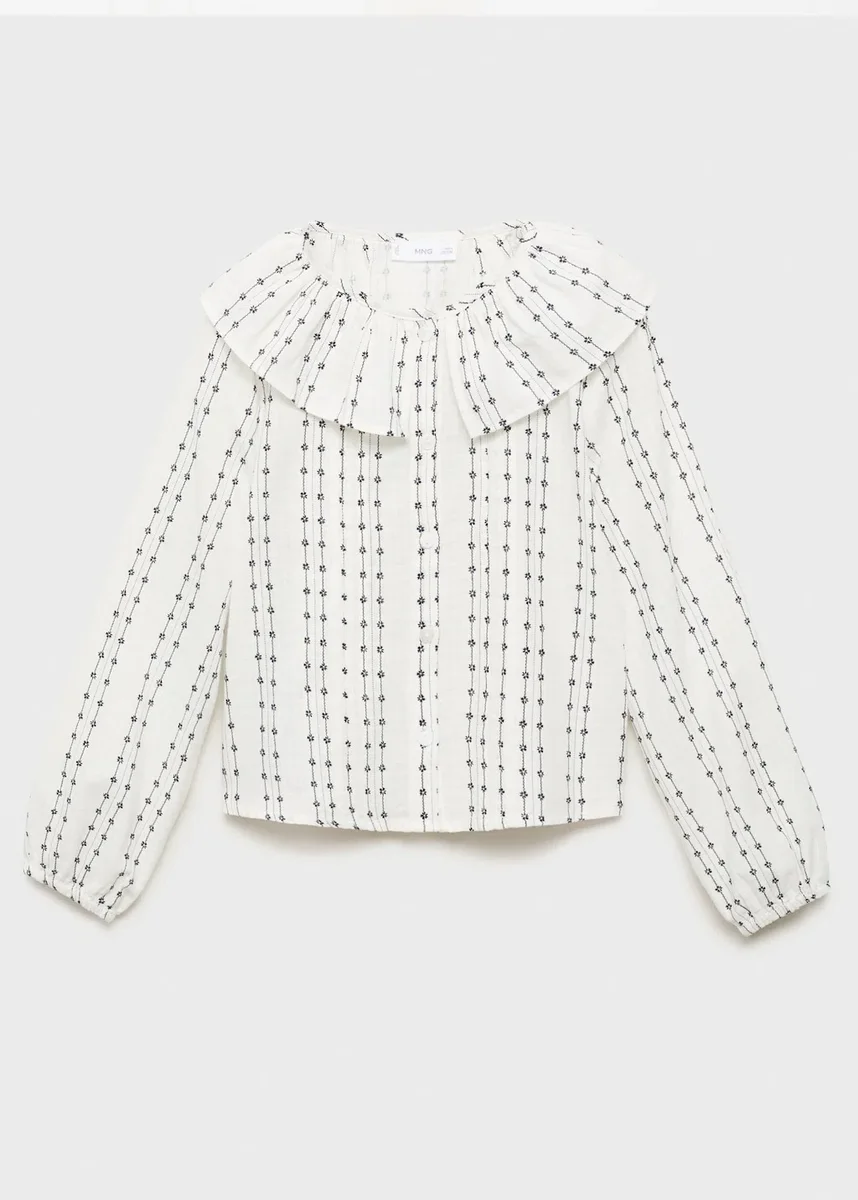 Ta bluzka wykonana w 100% z bawełny ma prosty krój i kwiatowy wzór. Kołnierzyk typu babydoll i długie rękawy z elastycznymi mankietami nadają jej charakterystyczny wygląd. Zapięcie na guziki z tyłu.