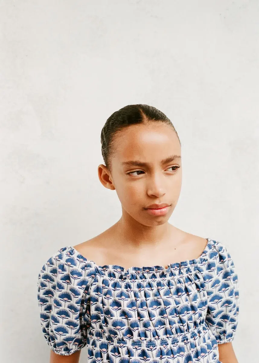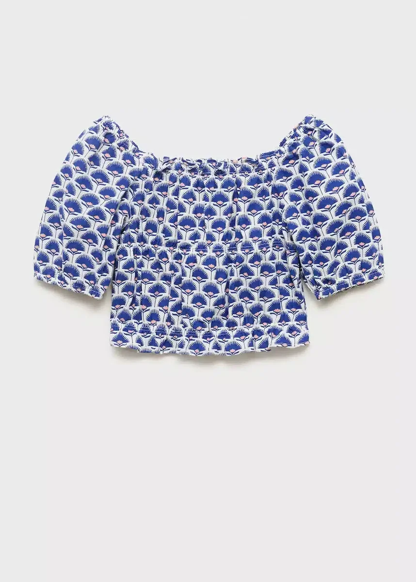Tkanina lniana. Tkanina z bawełny organicznej. Kwiatowy wzór. Otwarty okrągły dekolt. Elastyczny detal przy szyi. Puffowane krótkie rękawy. Elastyczny dół.