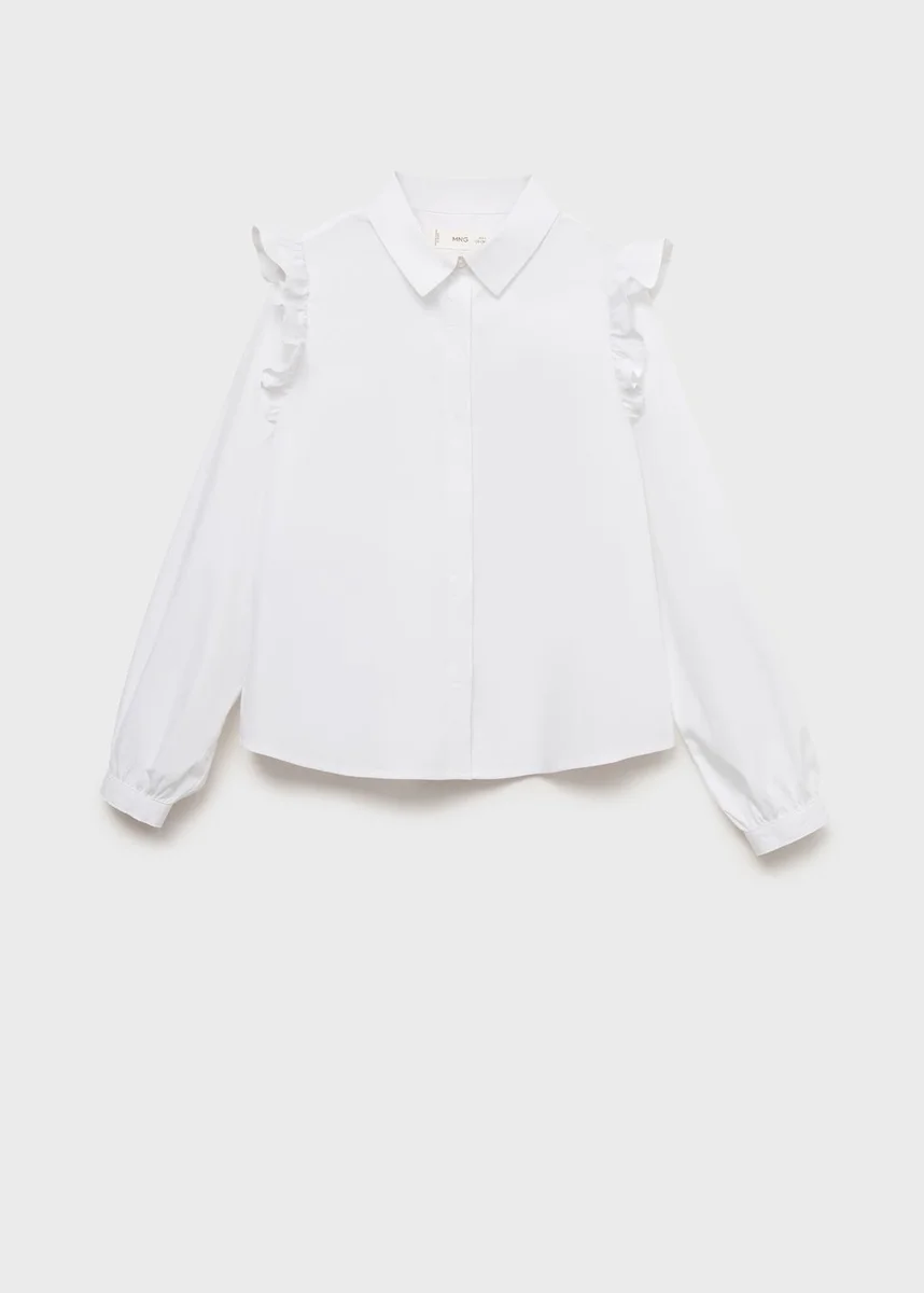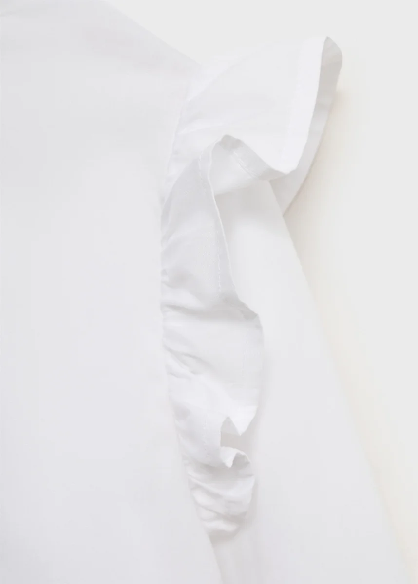 100% bawełna. Prosty krój. Długi fason. Kołnierzyk koszulowy. Długi rękaw. Marszczone wykończenie mankietów. Falbany na ramionach. Ukryte zapięcie na guziki z przodu.
