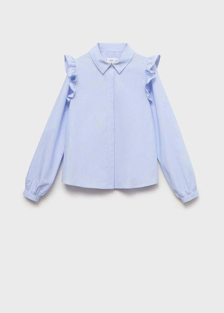 100% bawełna. Prosty krój. Długi fason. Kołnierzyk koszulowy. Długi rękaw. Marszczone wykończenie mankietów. Falbany na ramionach. Ukryte zapięcie na guziki z przodu.