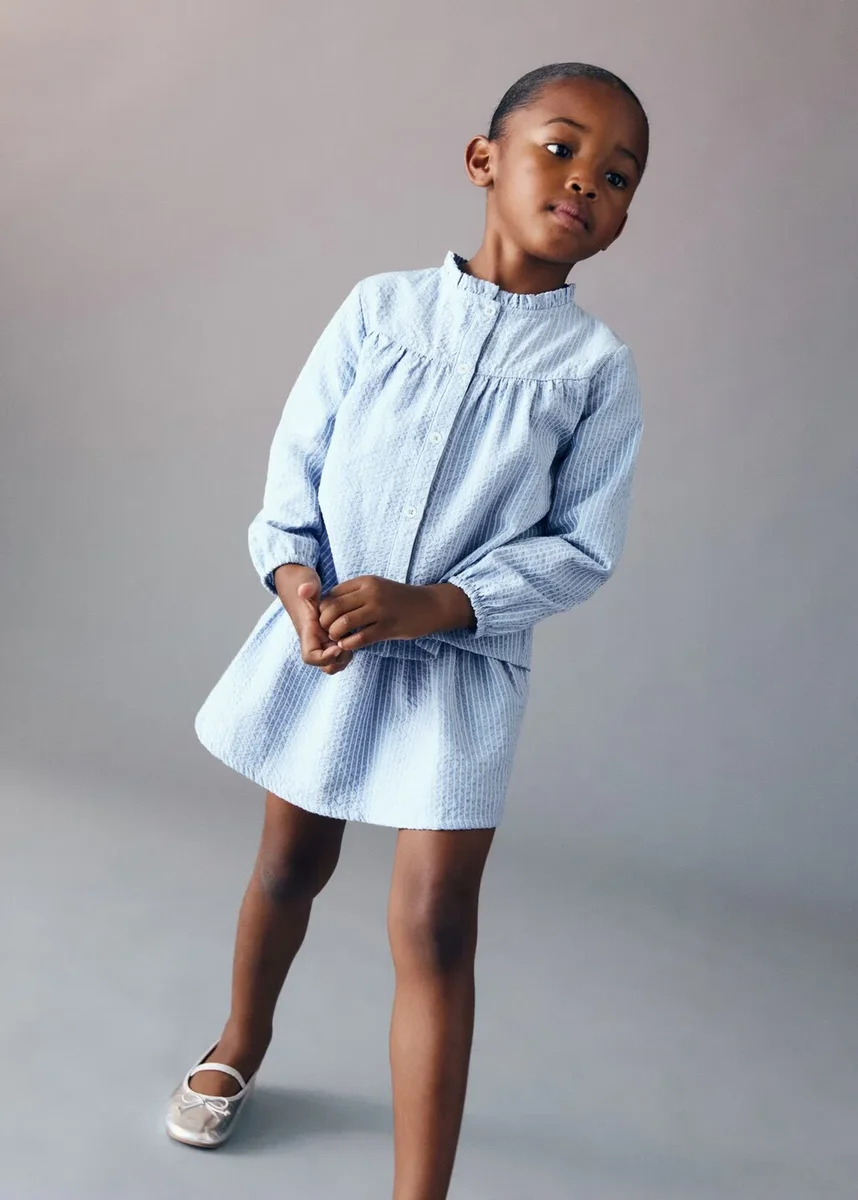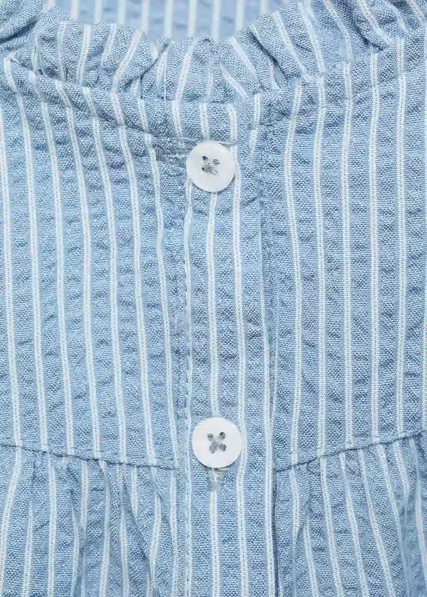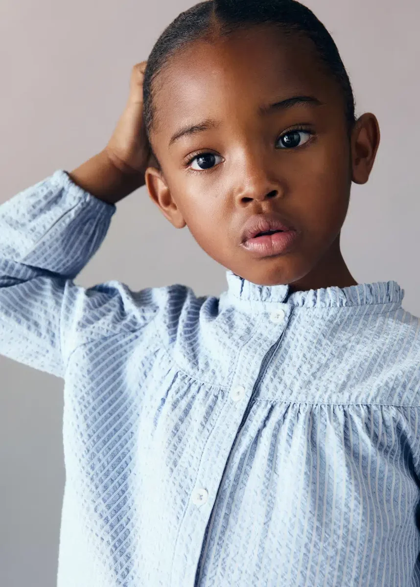 Ta bluzka z bawełnianej tkaniny w paski ma krój w kształcie litery A. Marszczona okrągła szyja i długie rękawy z elastycznymi mankietami dodają jej stylu, a zapięcie na guziki z przodu i marszczone wykończenie na piersi dopełniają jej design.
