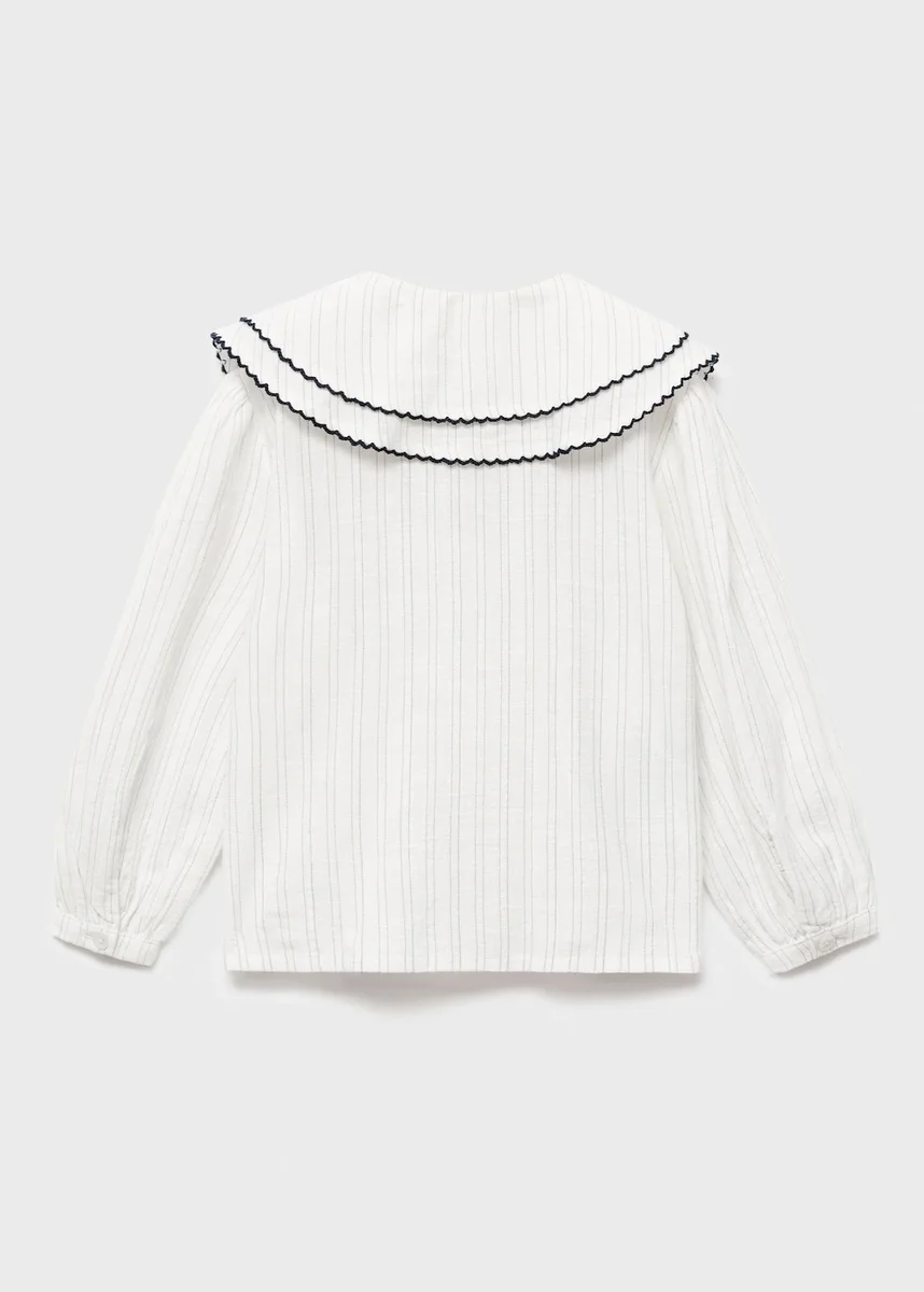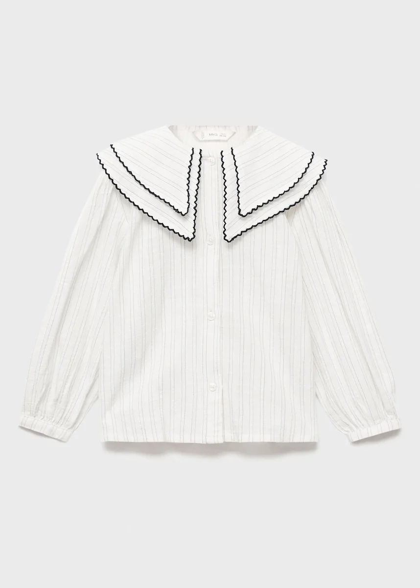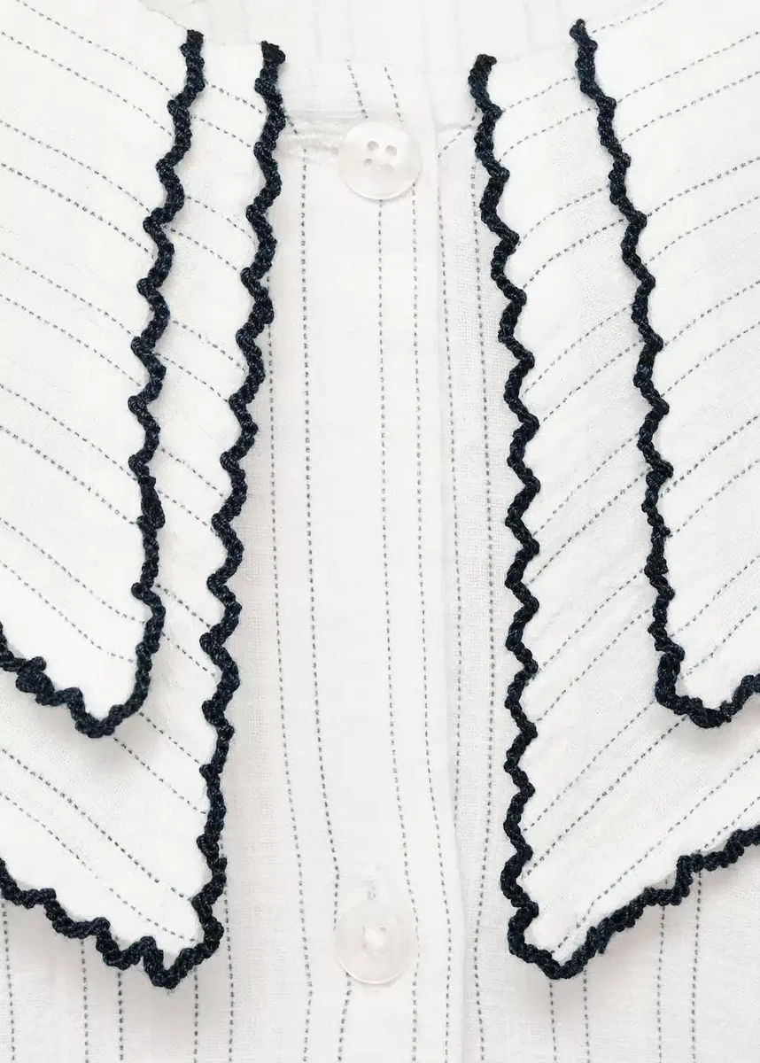 Wykonana w 100% z bawełny bluzka ma prosty krój w paski i kołnierzyk typu babydoll. Długie rękawy mają mankiety zapinane na guziki i kontrastowe wykończenia. Zapięcie na guziki z przodu dopełnia styl „Back to School”.