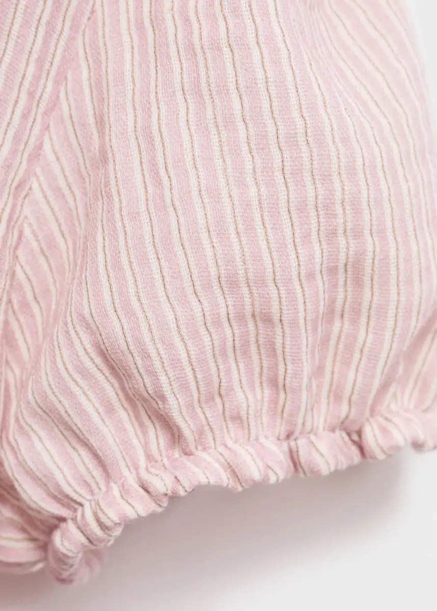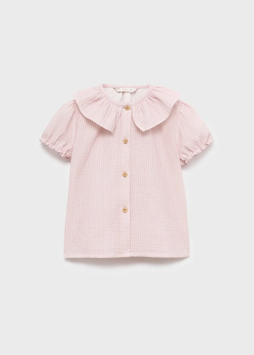 Ta bluzka wykonana w 100% z bawełny ma prosty krój w paski. Kołnierzyk typu babydoll nadaje jej charakterystyczny wygląd, a krótkie marszczone rękawy i zapięcie na guziki z przodu dopełniają całości.