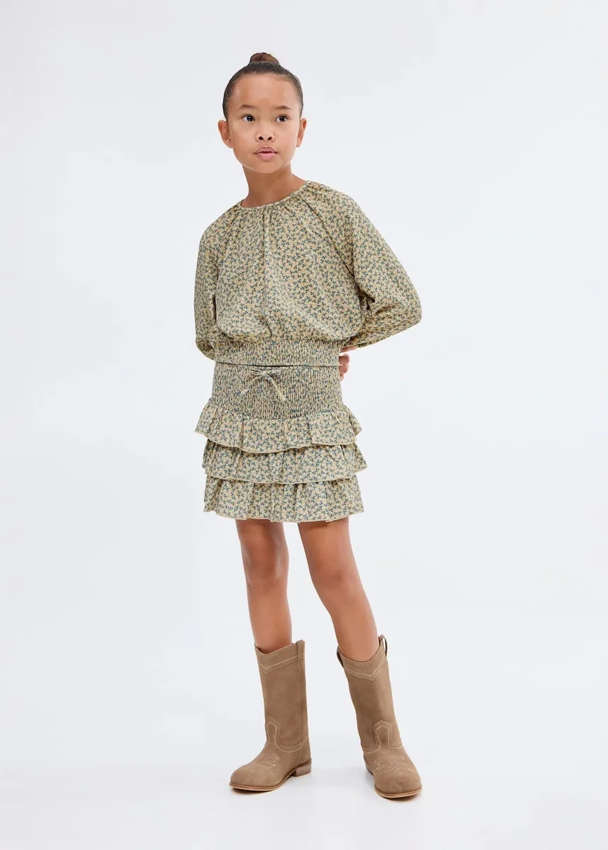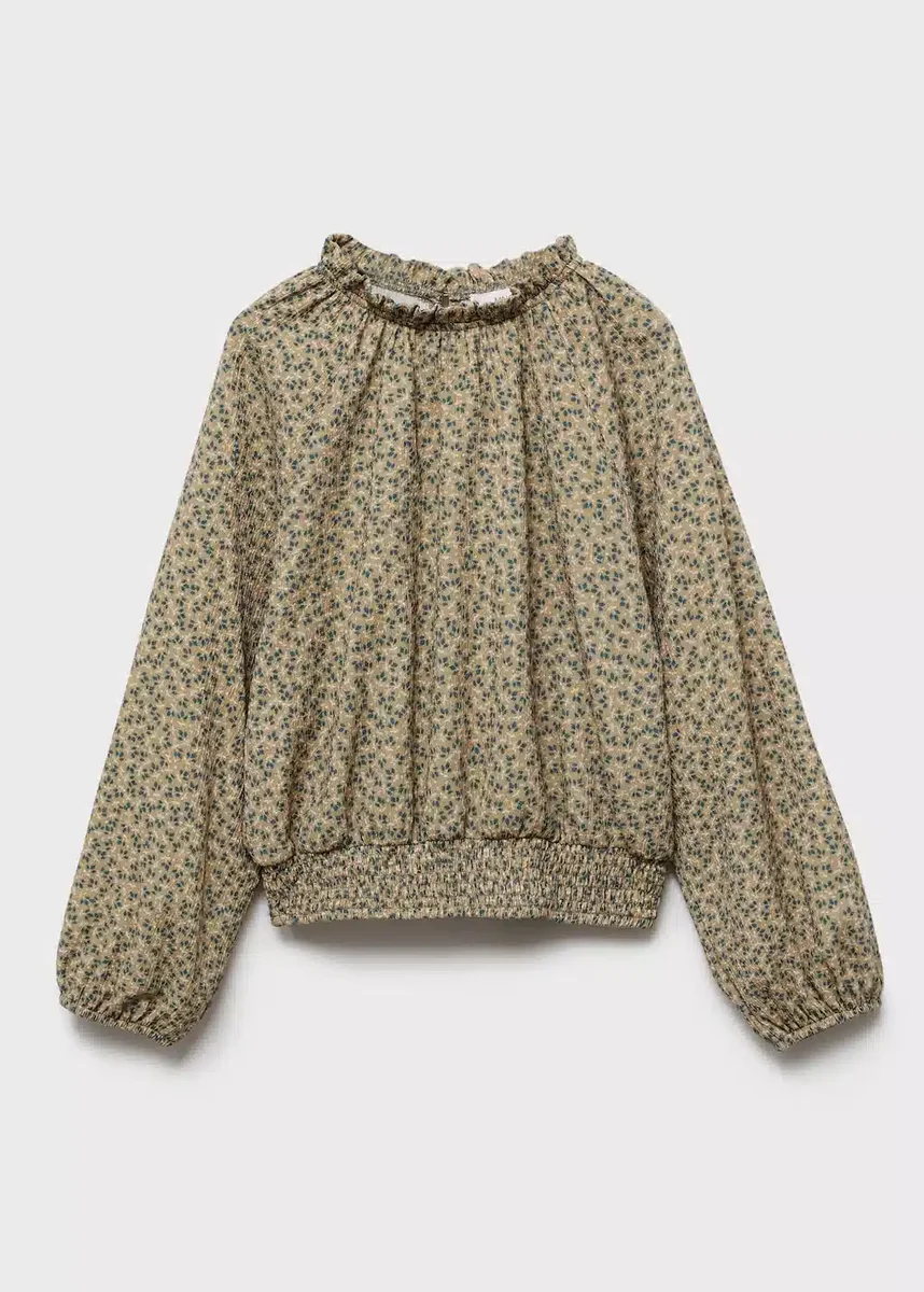 Płynny materiał. Kwiatowy wzór. Marszczona okrągła szyja. Zapięcie na guziki z tyłu. Długie bufiaste rękawy. Elastyczna plisa w talii. Całościowy look. Powrót do szkoły