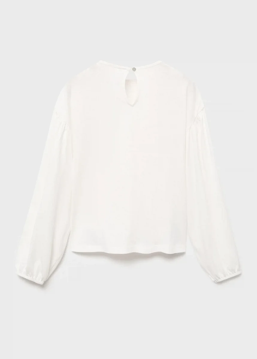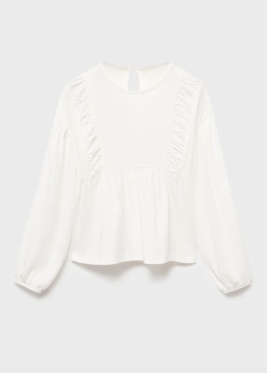 100% bawełna. Prosty krój. Marszczone detale. Okrągły dekolt zapinany na guzik. Długie rękawy z elastycznymi mankietami.