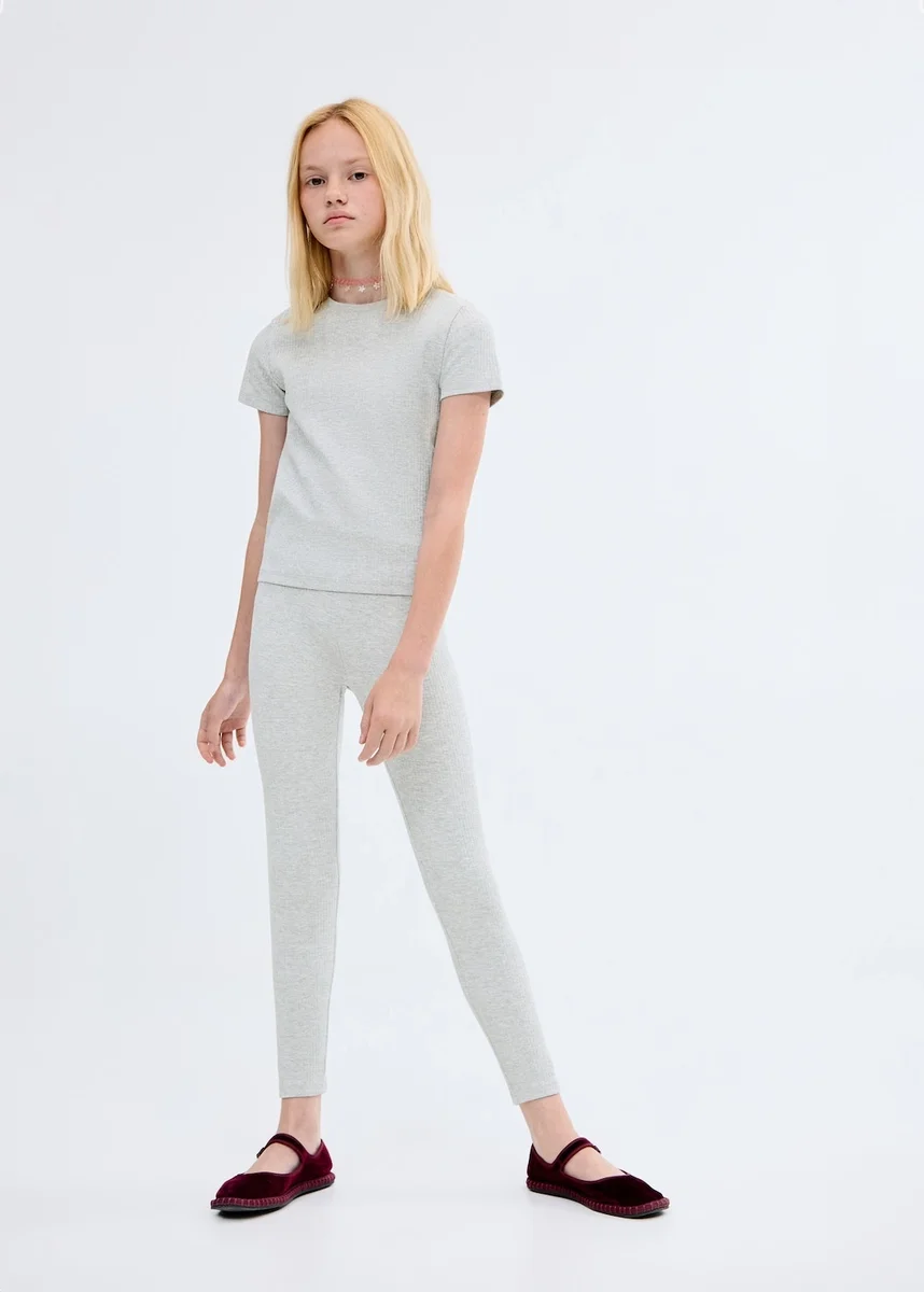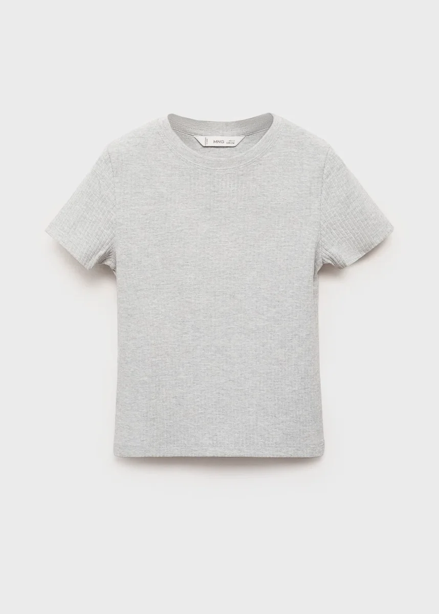 Tkanina bawełniana. Tkanina elastyczna. Prążkowany krój. Prosty krój. Okrągły dekolt. Krótkie rękawy.