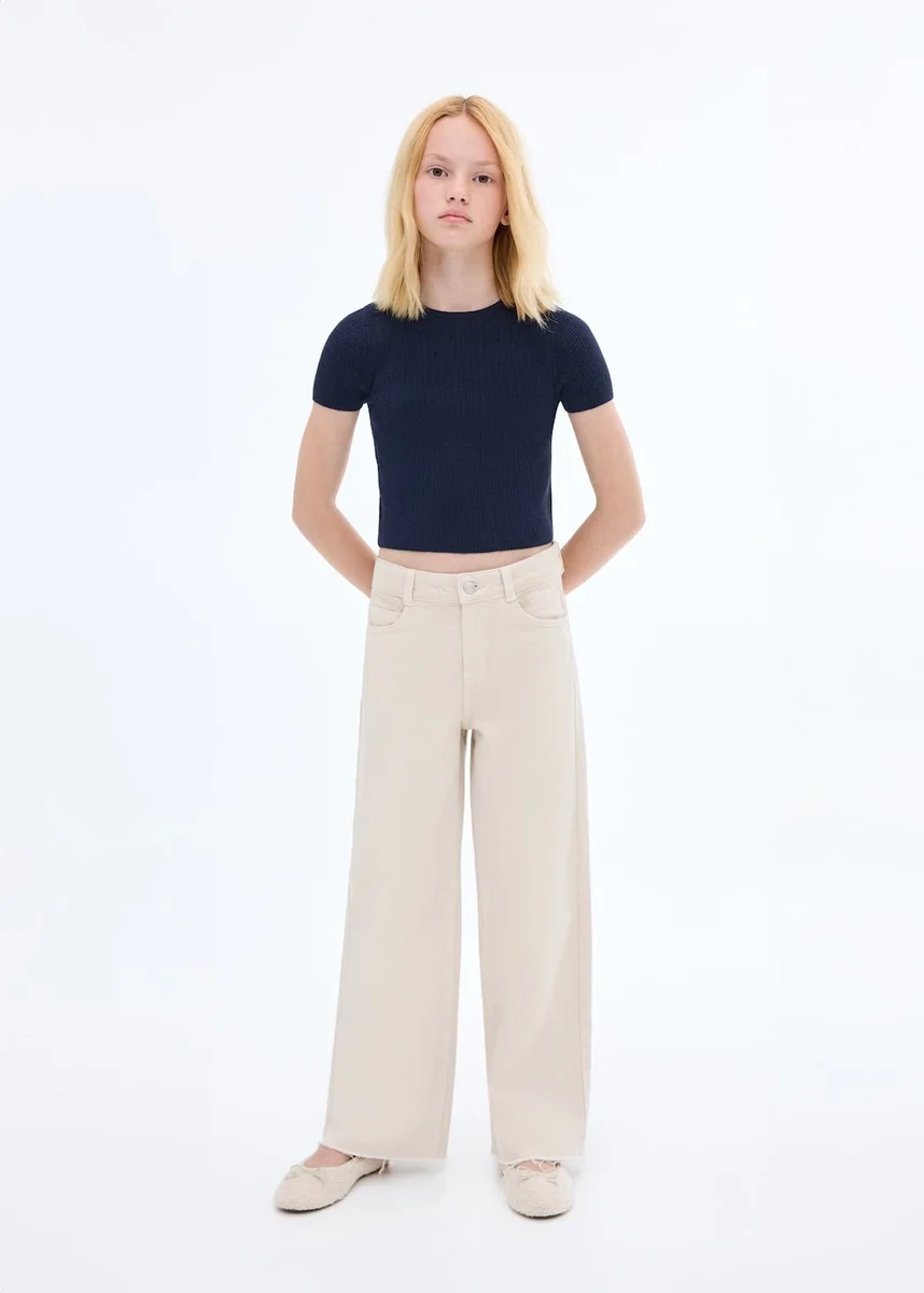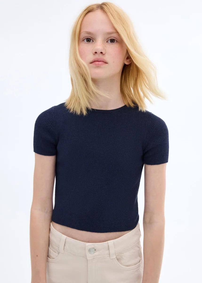 Tkanina bawełniana. Dzianina. Prążkowany krój. Krótki krój. Okrągły dekolt. Krótki rękaw.