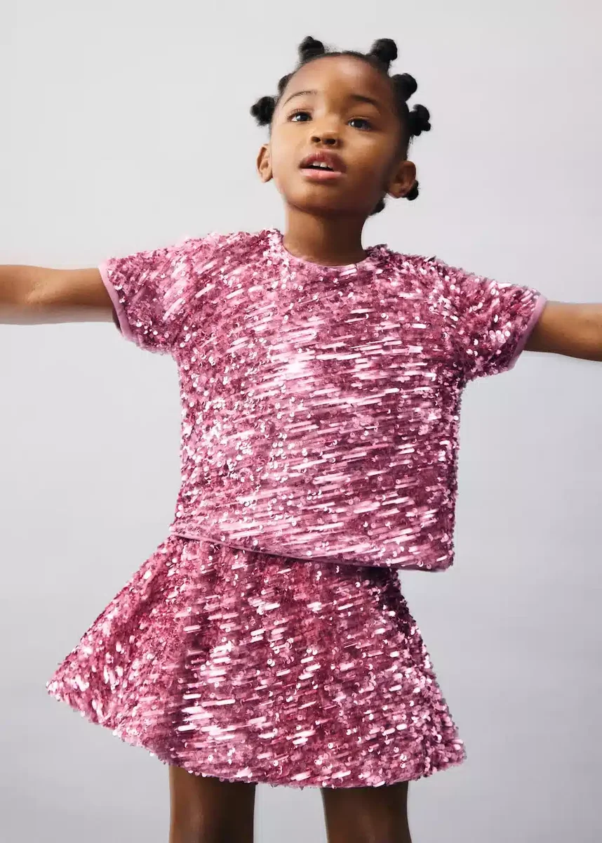 Wykonana z tkaniny z cekinami, ta odzież ma prosty i błyszczący krój. Ma okrągły dekolt zapinany na guziki, krótkie rękawy i wewnętrzną podszewkę. Jest częścią kolekcji świątecznej oraz imprezowej i eventowej, idealnej do stworzenia kompletnej stylizacji.