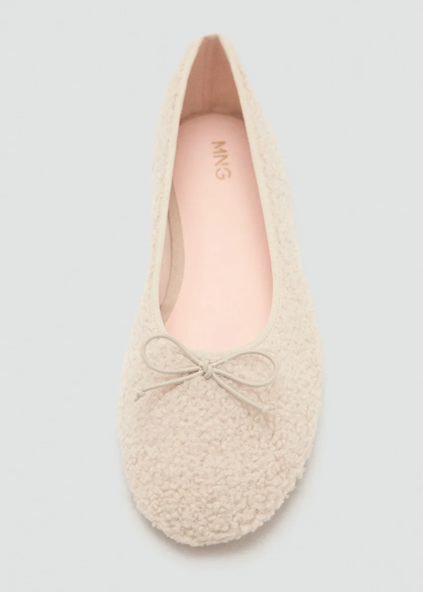 Tkanina ze sztucznej owczej skóry. Okrągły nosek. Ozdobna kokardka. Powrót do szkoły. Kolekcja świąteczna.